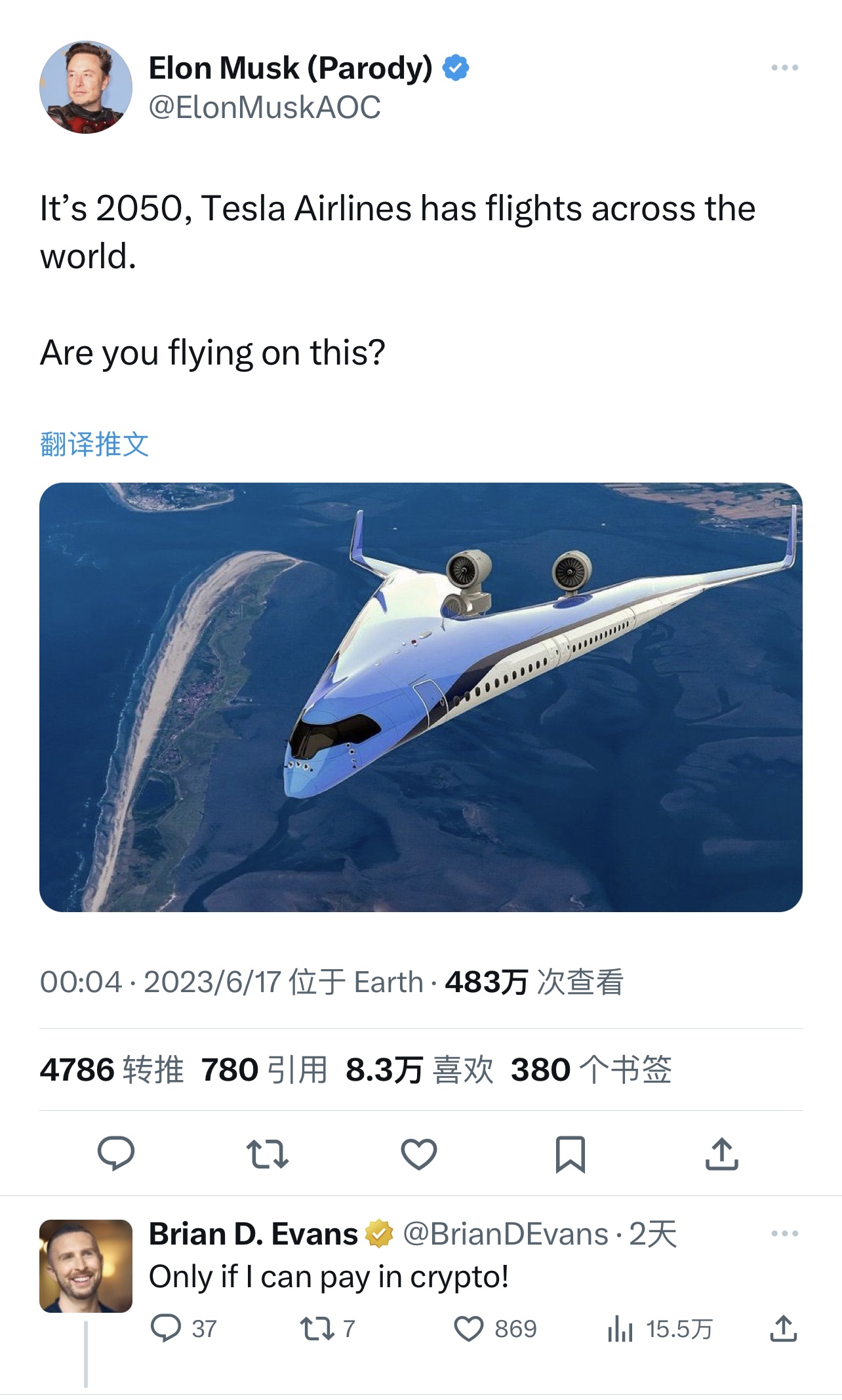 馬斯克配圖的飛機造型也很獨特,似乎是雙機身設計,另闢蹊徑。他在推文中詢問大家會否選擇乘坐,和馬斯克互關的世界500強企業家Brian D. Evans調侃:「只要能用比特幣支付,我就坐!」馬斯克認真回應:「目前還未知會否有這個選項。」