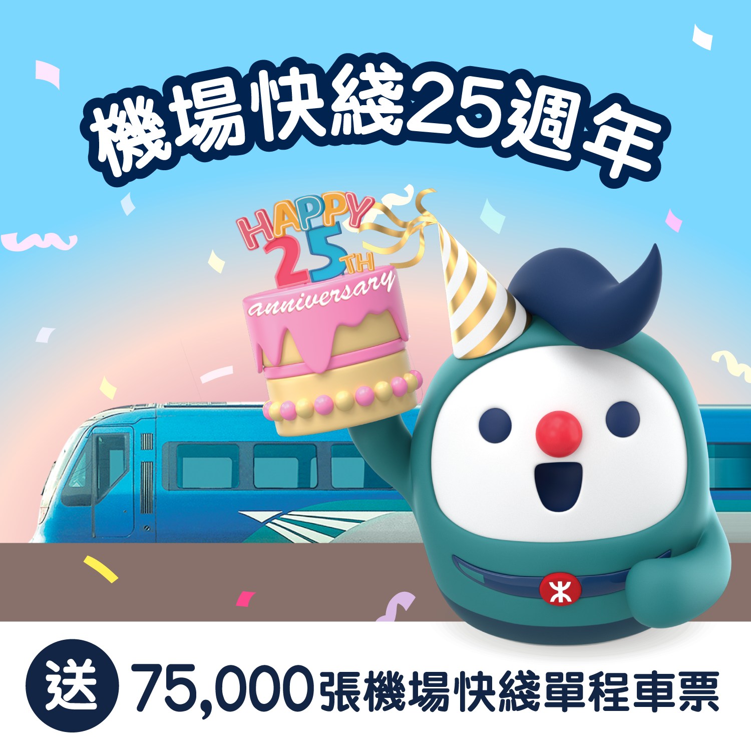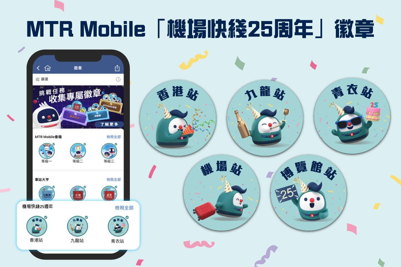 機鐵仔將於7月及8月快閃現身機場快綫九龍站、青衣站及香港站,大派25周年限量版紀念襟章。粉絲可於7月14日、7月28日及8月11日同機鐵仔見面影相打卡,兼獲得限量版紀念襟章。MTR Mobile亦推出特別版虛擬徽章供大家收集。由即日起至8月31日,只要使用已連結至MTR Mobile賬戶的八達通乘搭機場快綫,不僅可以收集到MTR Mobile「車站大亨」原有的徽章,更可獲得MTR Mobile「機場快綫25周年」特別版徽章。