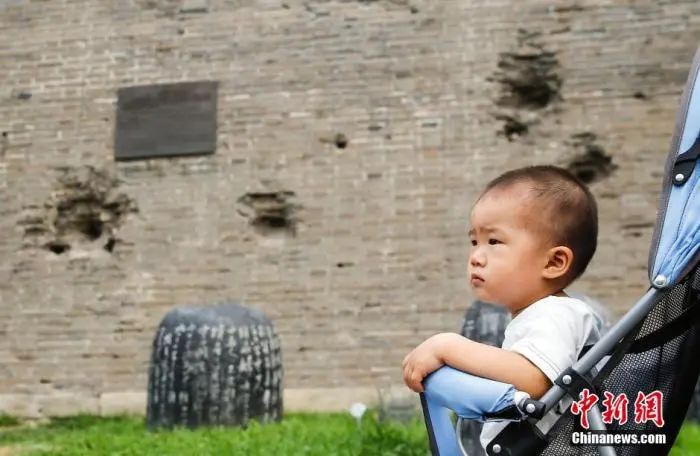 「全民族抗戰爆發77周年」紀念日,一名嬰兒在盧溝橋宛平城外的彈坑前留影。(中新社)