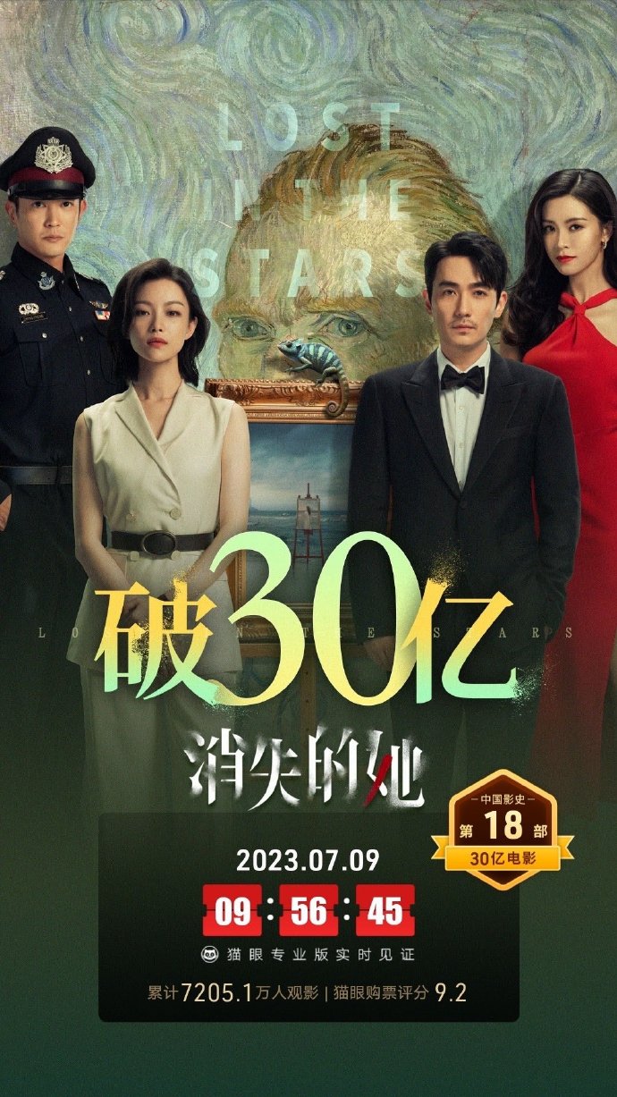 【點新聞報道】據貓眼專業版數據顯示,7月9日上午10時,上映18天的電影《消失的她》累計票房突破30億,成為內地影史上第18部票房破30億的電影。同時,《消失的她》全球票房成績超《疾速追殺4》進入今年全球票房榜前十。
