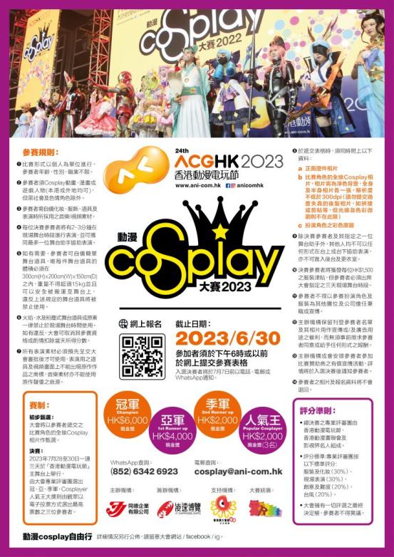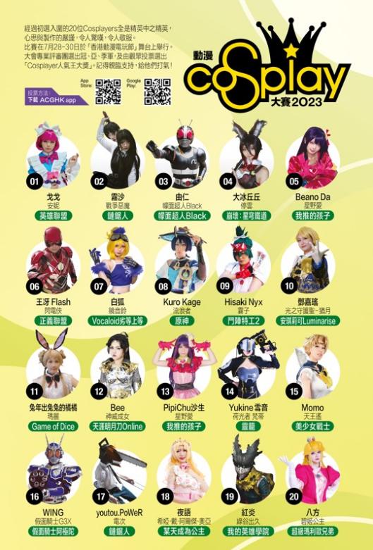 有20位參賽Cosplayer將會喺7月28至30日(星期五至日)一連三日,在香港動漫電玩節主舞台進行總決賽。觀眾除咗可以當日入場睇表演幫佢哋打氣之外,7月17日起喺ACGHK App入面投選你最支持嘅參賽者,最高票數嘅三位將會得到「人氣王」獎項!