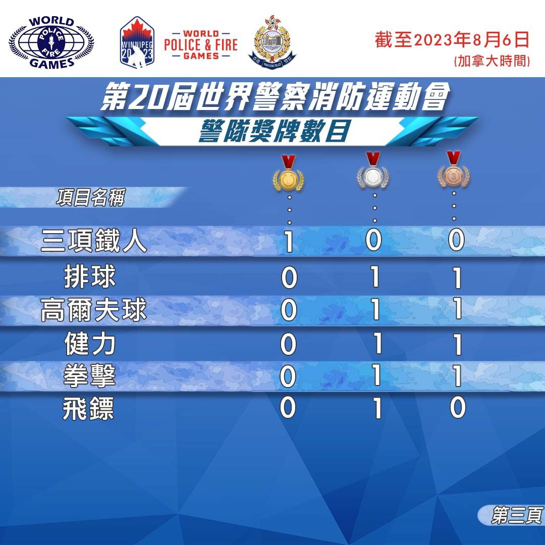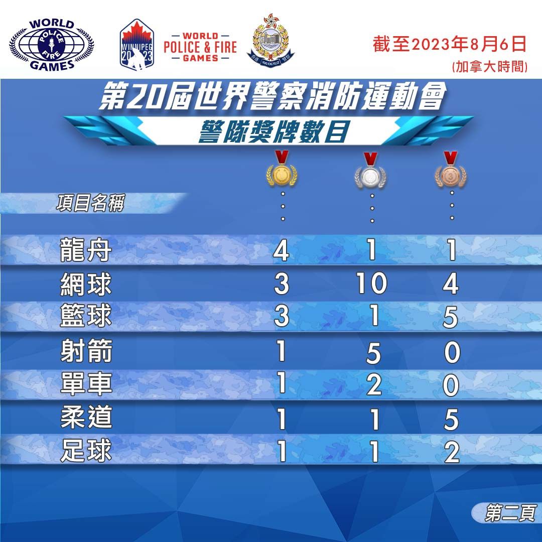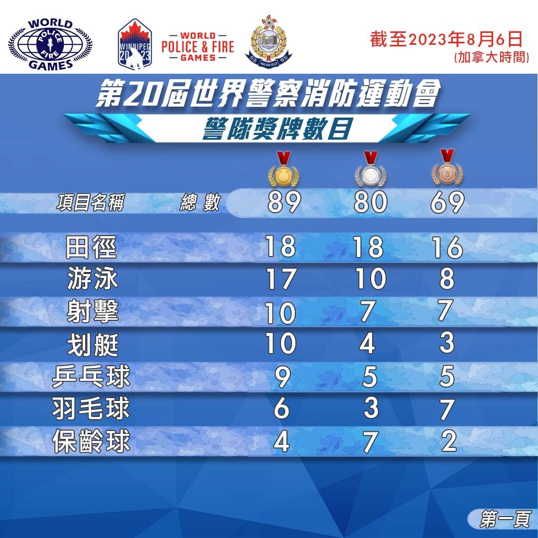 【點新聞報道】在加拿大舉行的第20屆世界警察及消防運動會結束,香港警隊在各項賽事合共取得238面獎牌。警方今日(7日)在社交網頁表示,今年世警會有超過50個地區、約12000名執法人員參與,經過10日賽事,香港警隊取得89面金牌、80面銀牌和69面銅牌,成績是歷屆之冠。