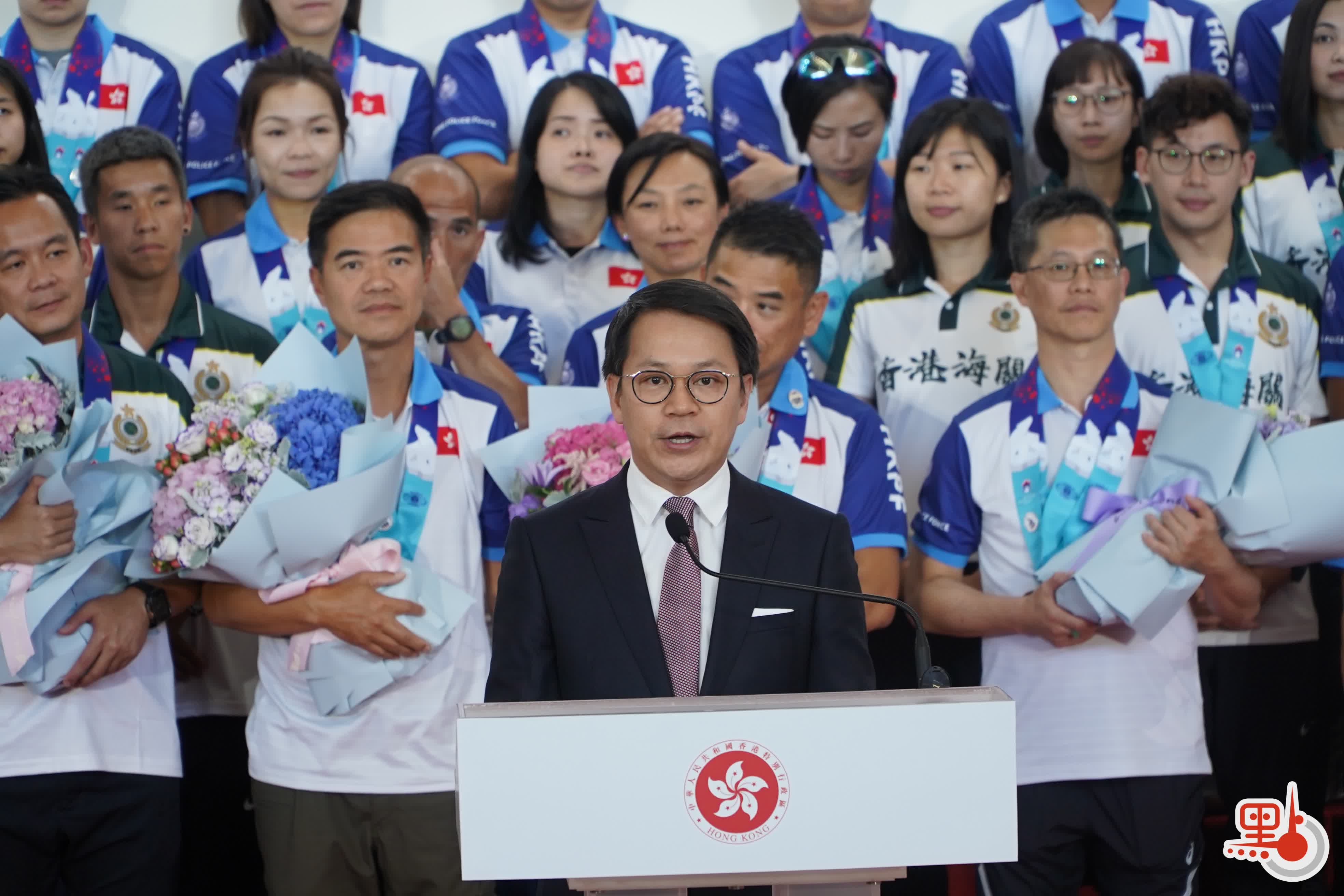 【點新聞報道】香港警務處、海關、懲教署和消防處早前派出代表團到加拿大參與2023年世界警察及消防運動會,經過10日賽事,代表團共取得97面金牌、90面銀牌和88面銅牌,成績是歷屆之冠。部分成員今日(8日)下午返港,特區政府在香港國際機場舉行儀式,迎接代表團凱旋歸來。政務司司長陳國基、保安局局長鄧炳強、保安局常任秘書長李百全、警務處處長蕭澤頤和海關關長何珮珊會出席。