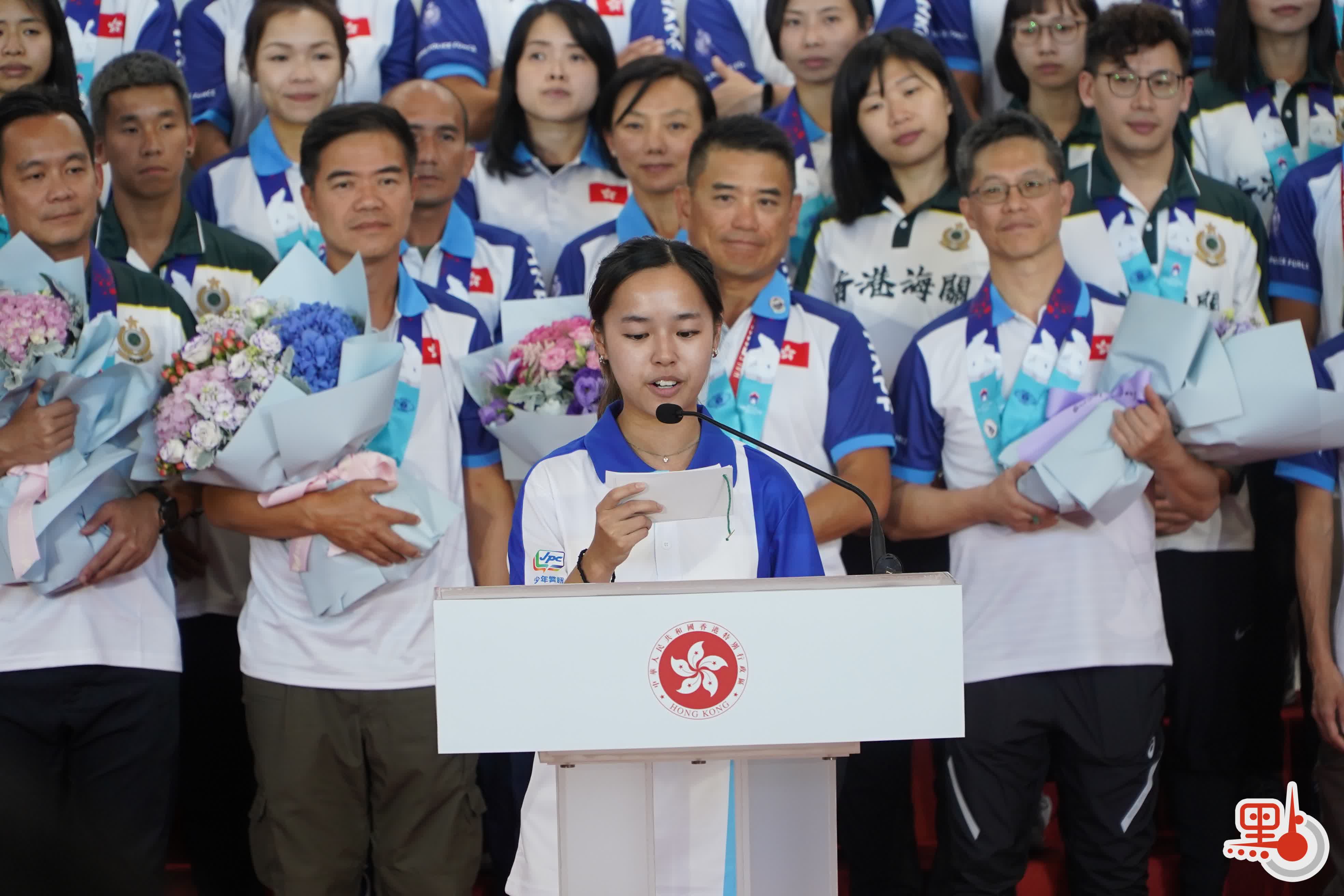 少年警訓成員代表何小朋友表示,作為少年警訓的一分子,她一直以警察為榜樣,這次警隊取得破紀錄的成績,她感到十分驕傲,指香港警察不僅在日常執行任務期間表現出非常專業和高水準,警察哥哥姐姐也在運動場上表現出色。她明白大家不僅取得很多獎牌,也破了多項紀錄,展現出高水準專業和體能,向世界彰顯香港警察的優秀形象。這項國際盛事不僅是一場競技,更是一次國際交流以及合作的重要時刻,健兒們代表香港警察向世界展現團結拚搏和不屈不撓的精神形象,惟卓越成績的背後一定付出不少努力和汗水,犧牲業餘休息時間。何小朋友表示,紀律部隊的精英們是年輕一代學習的好榜樣,希望未來傳承他們不怕辛苦、不屈不撓、追求卓越成績的精神,將來為香港作出更大貢獻。