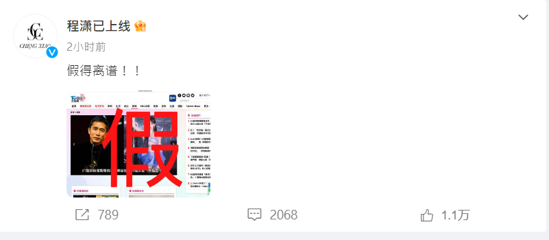 程瀟今日(12日)於官方微博轉發相關報道截圖,並以「假得離譜」四字否認傳聞。