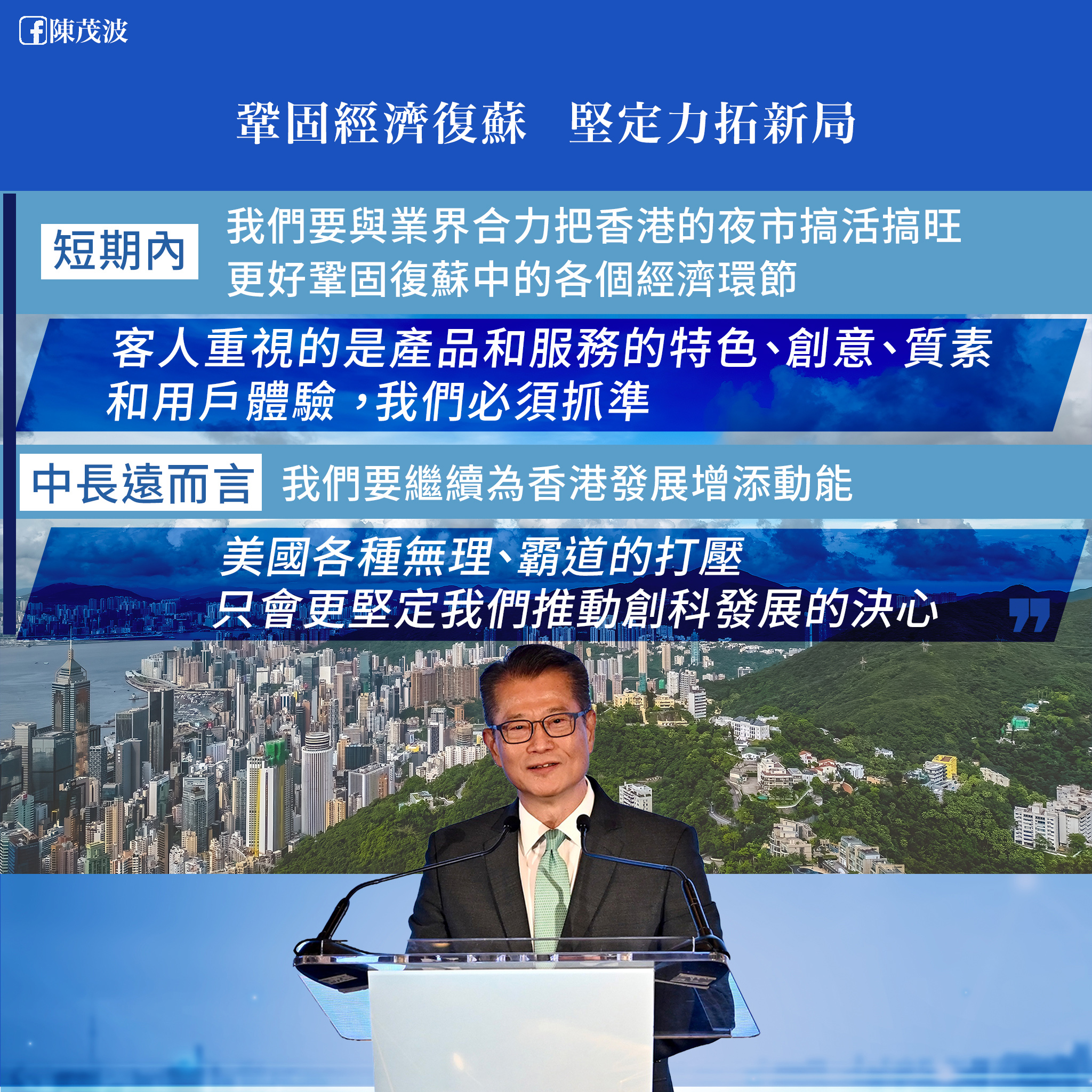 陳茂波說,要抓緊機會,推動香港旅遊業朝多元、高增值、可持續的方向發展。當中,大型盛事、國際會議展覽等活動對吸引高增值旅客尤為重要,這亦是世界各地力爭的旅遊板塊。今年《財政預算案》便預留了一億元爭取更多吸引旅客和極具旅遊宣傳效果的大型盛事來港舉行,提升香港的國際形象;又撥款超過2億5千萬元予旅發局繼續舉辦多項大型旅遊盛事,包括下半年的美酒佳餚巡禮、香港單車節、繽紛冬日巡禮等;並投放資源積極爭取更多不同類型、不同行業的國際會議與展覽在港舉行,鞏固香港作為區內首選會展旅遊目的地的地位。