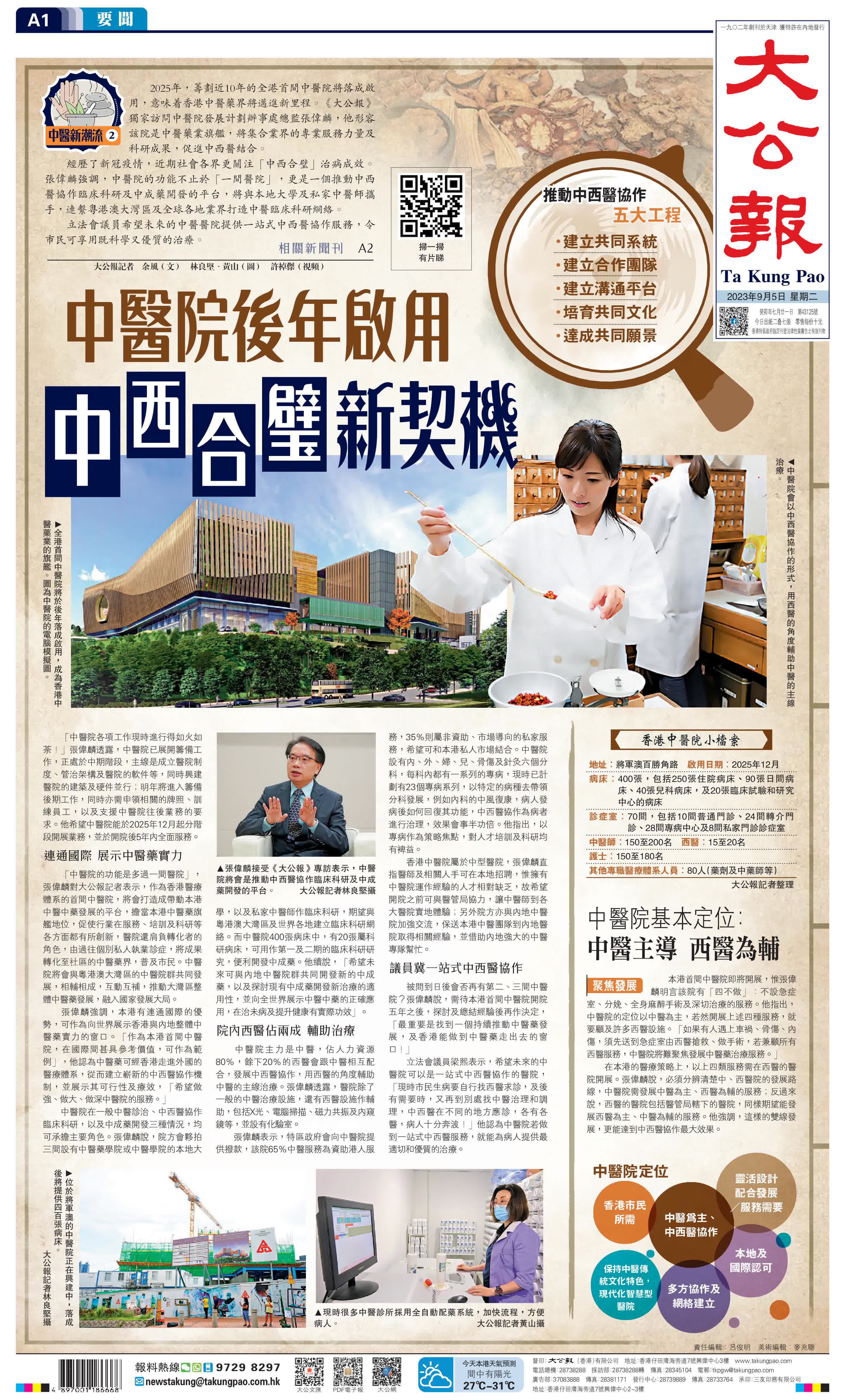 2025年,籌劃近10年的全港首間中醫院將落成啟用,意味着香港中醫藥界將邁進新里程。《大公報》獨家訪問中醫院發展計劃辦事處總監張偉麟,他形容該院是中醫藥業旗艦,將集合業界的專業服務力量及科研成果,促進中西醫結合。
