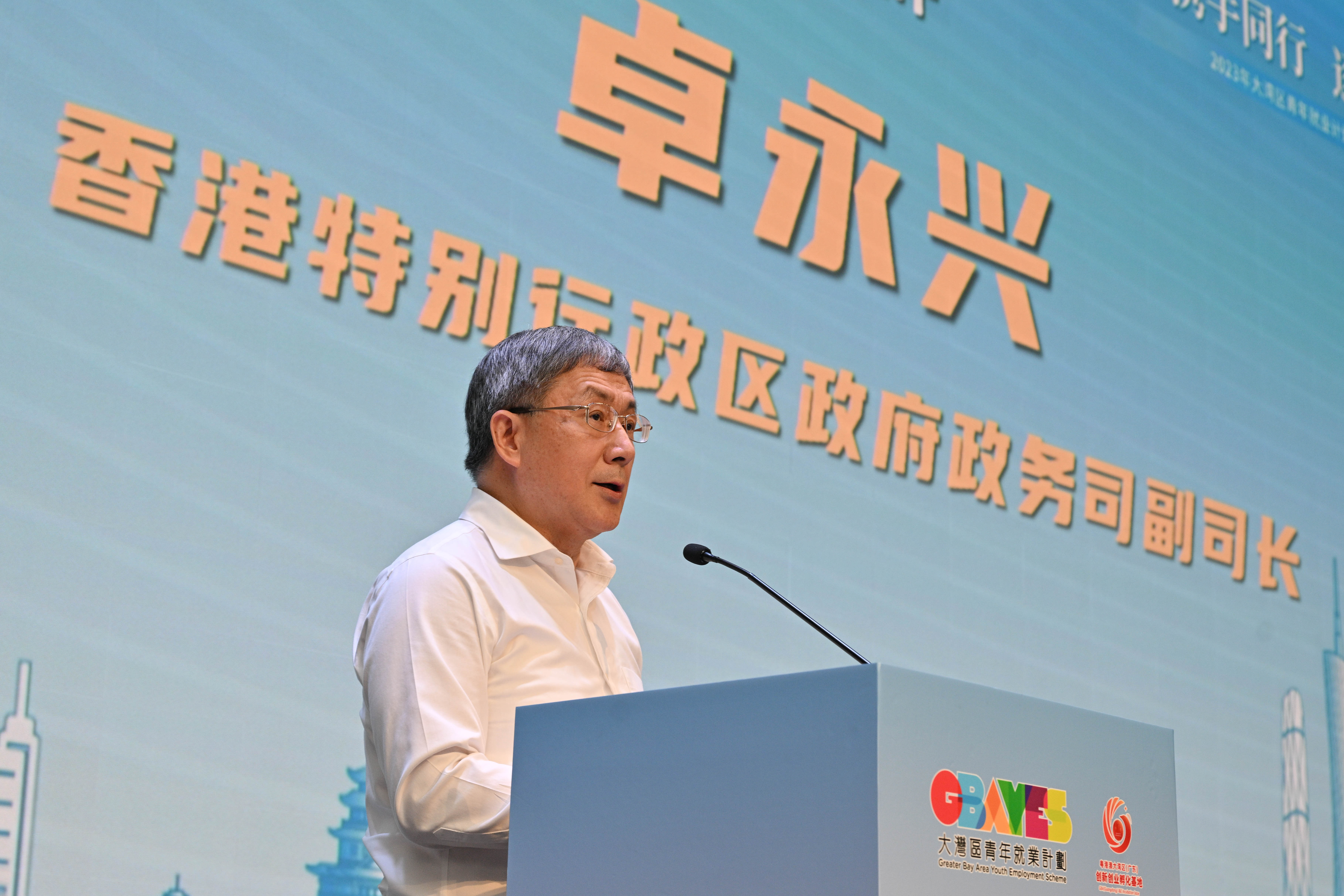 政務司副司長卓永興致辭時表示,去年二十大報告指出:「青年強,則國家強。當代中國青年生逢其時,施展才幹的舞台無比廣闊,實現夢想的前景無比光明。」他指粵港澳大灣區作為國家高品質發展的示範地,正是培育青年成才的重要舞台之一;香港特區政府致力推動香港青年投入大灣區建設行列,發揮自身所長,服務灣區所需。