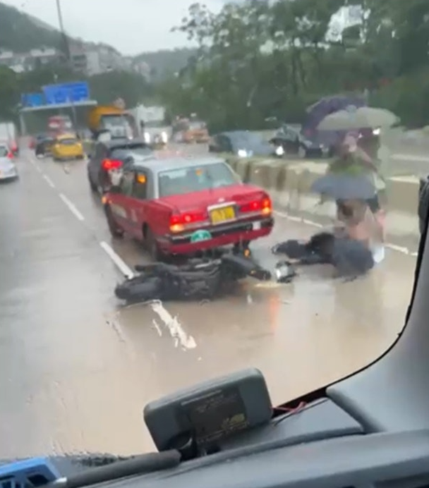 有市民於網絡上載事故發生路段圖片,可見電單車收掣不及撼向的士,鐵騎士倒地,腳部受傷,清醒送院。