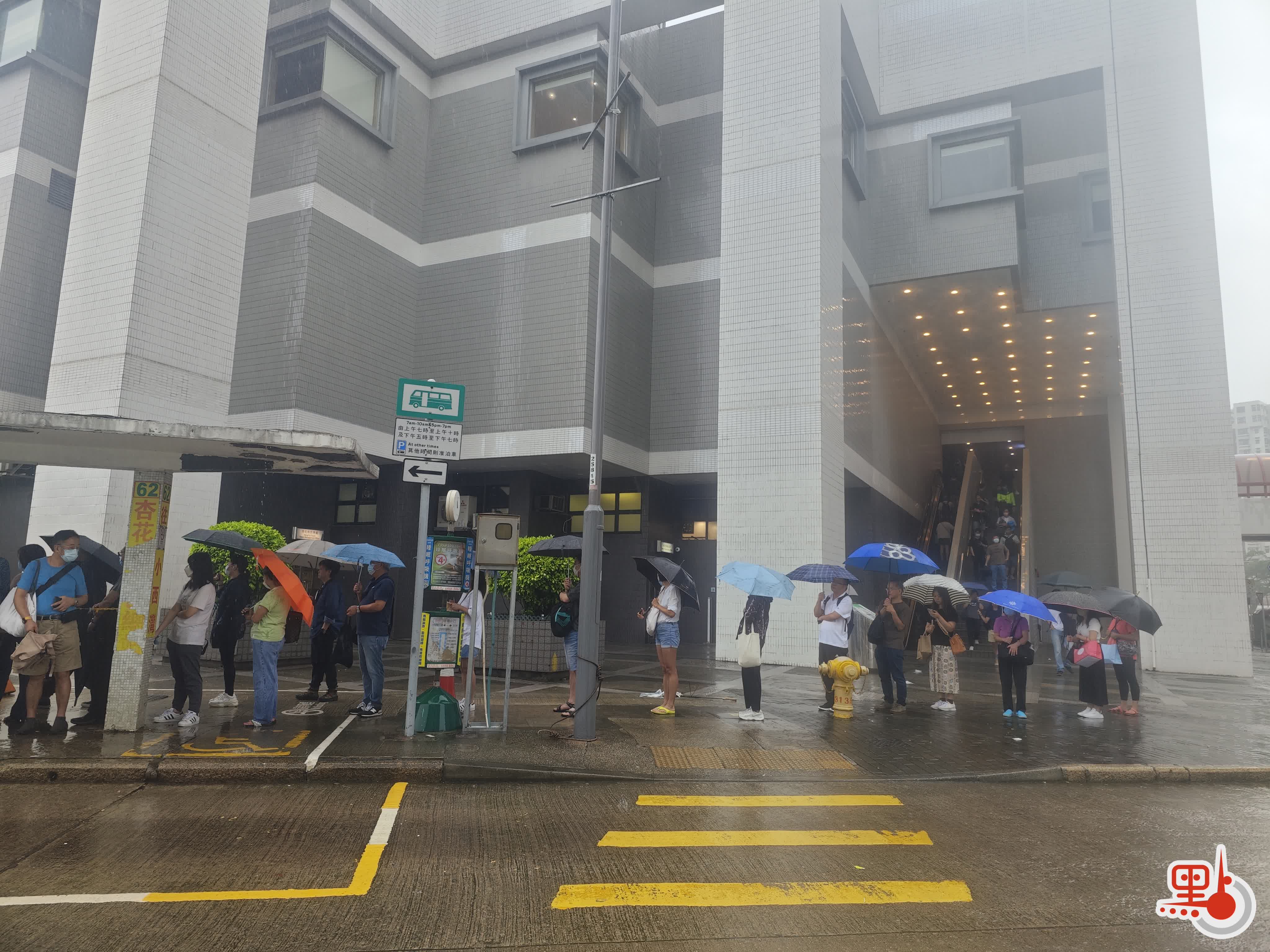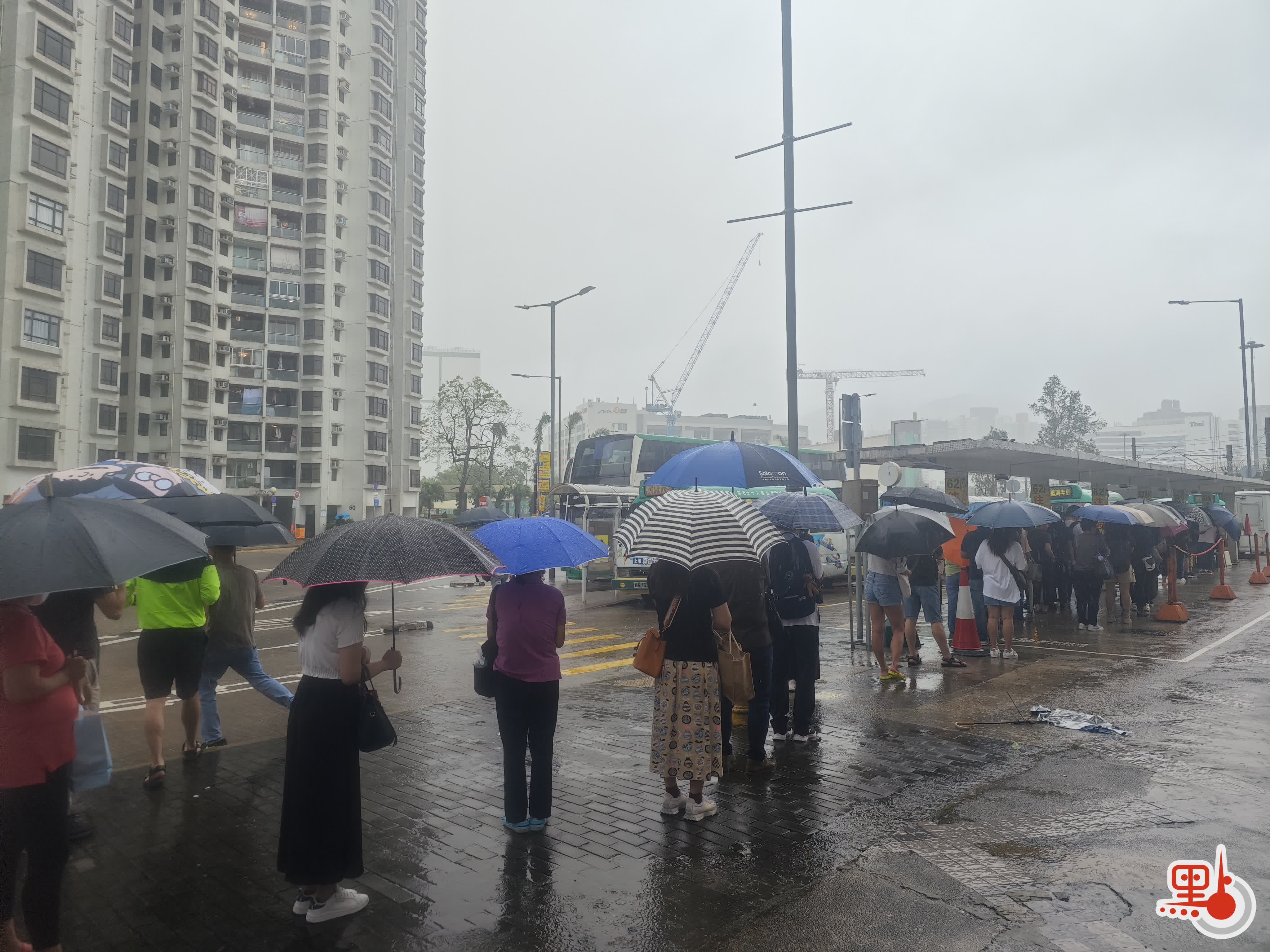 【點新聞報道】隨着颱風「小犬」遠離香港,本地風力將逐漸緩和。天文台在今日(9日)上午11時40分改發三號強風信號,但市面仍大風大雨,但不少市民在「3號波」生效後要撲回公司上班。點新聞記者發現在杏花邨巴士站及大埔墟港鐵站都排起人龍,大部分都是趕着返工的市民。
