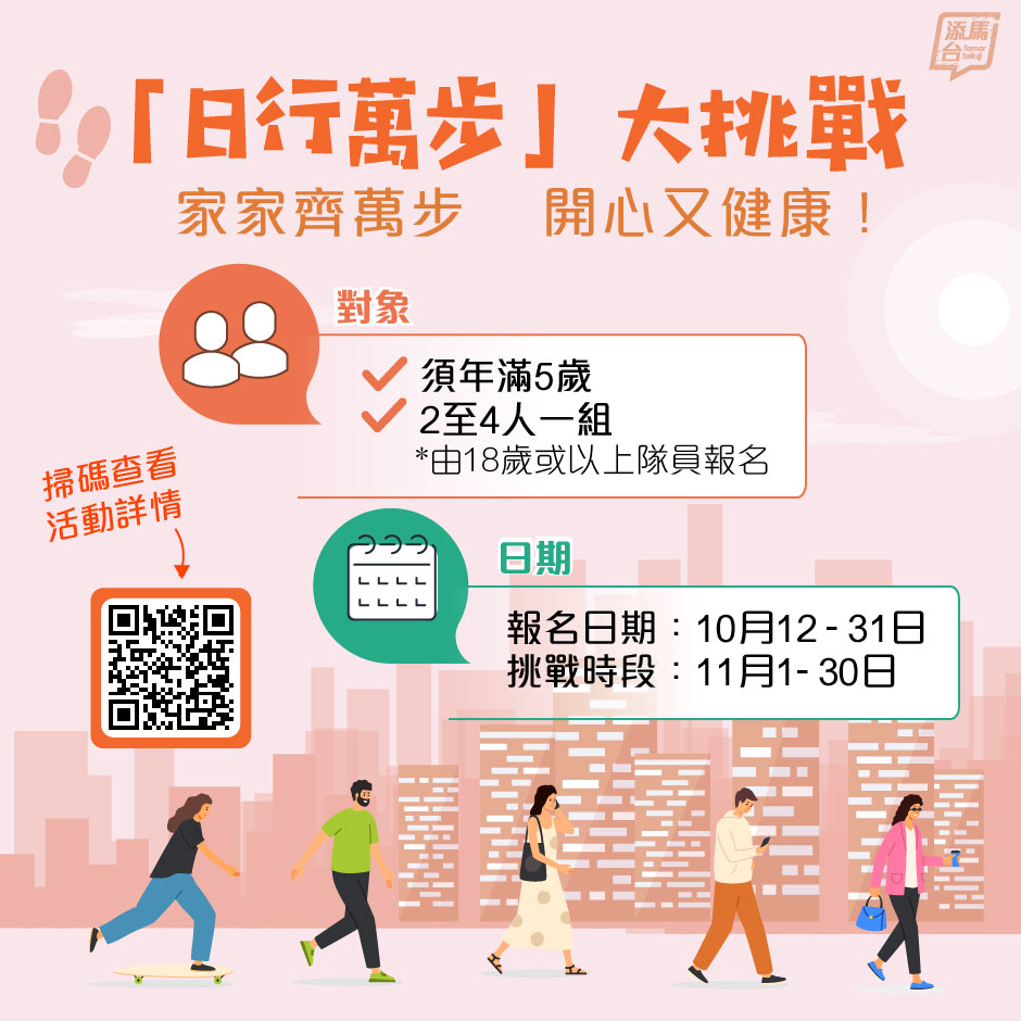 衞生署早前表示,第二階段步行挑戰以「家家齊萬步,開心又健康」為口號,旨在讓更多市民認識步行對身心健康的益處,並鼓勵家庭成員或朋友之間互相支持,一起散步,將日行萬步融入日常生活。報名日期由今日(12日)開始,挑戰時段於今年11月進行。市民可與家庭成員或朋友組成二至四人的隊伍參加。