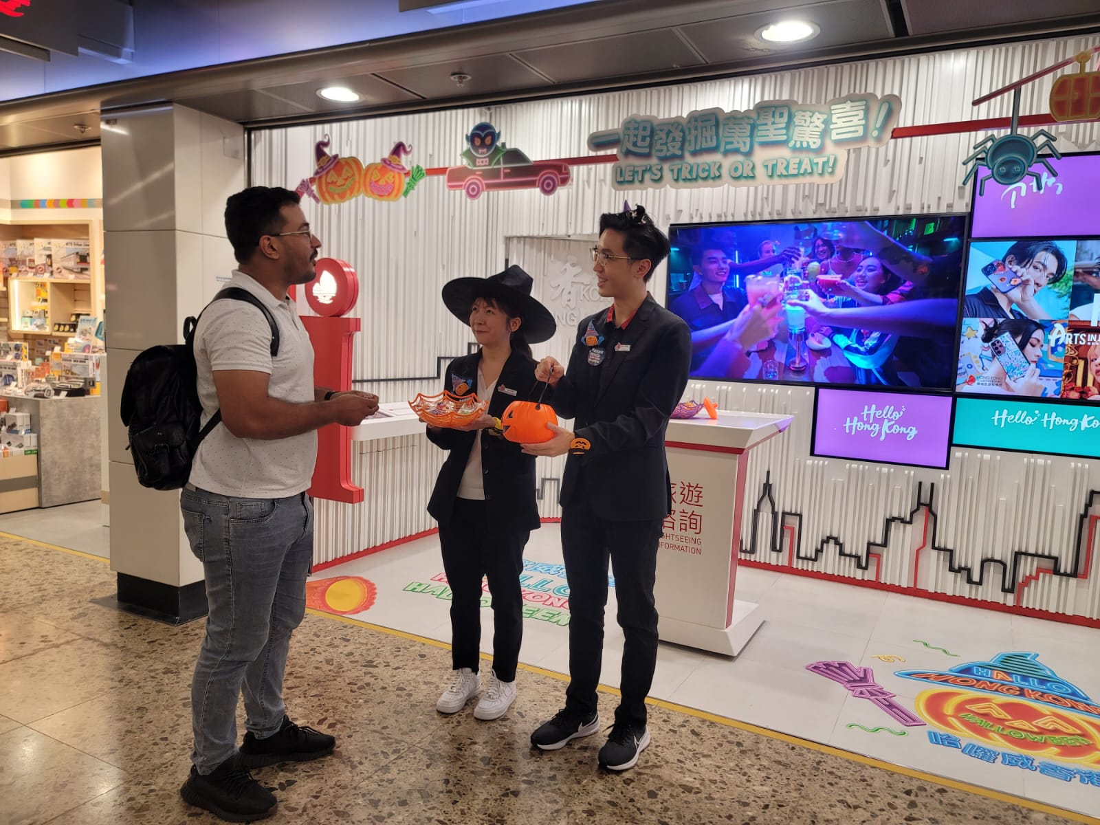 旅發局位於香港國際機場﹑高鐵西九龍站及尖沙咀天星碼頭的旅客諮詢中心,即日起會來個「淘氣轉身」,添上全新萬聖節主題海報﹑裝飾等,與全城同歡萬聖節。旅客可親臨中心大玩「Trick or Treat」獲贈美味糖果,旅發局更會為旅客量身訂制個人化的萬聖節行程,並在萬聖夜前夕向旅客送出限量節日飾物。