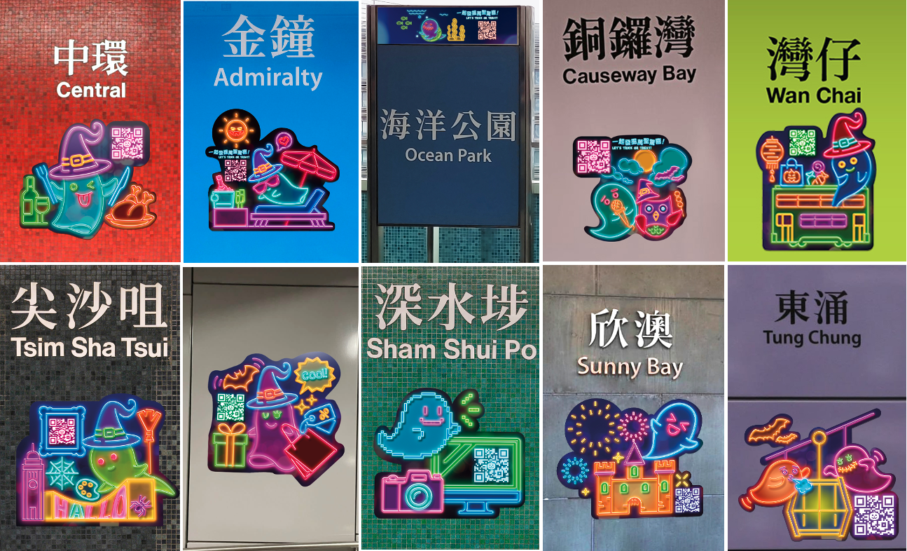 港鐵金鐘站及銅鑼灣站即日起亦陸續化身成萬聖節主題車站,以南瓜為主題的裝飾遍布站內大堂﹑月台地面﹑樓梯﹑扶手電梯﹑牆壁﹑出入口等位置,歡迎旅客踏上旅途之餘,亦吸引市民在繁忙的車站裏放慢腳步,感受節日氣息,打卡留影。節慶主題裝飾也會同步點綴港鐵中環站﹑灣仔站及尖沙咀站。