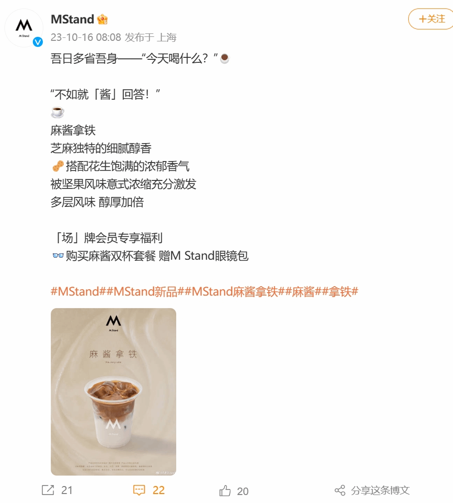 【點新聞報道】內地咖啡品牌MStand官方微博16日宣布將推出「麻醬拿鐵」,而相關詞條也很快登頂了微博熱搜。