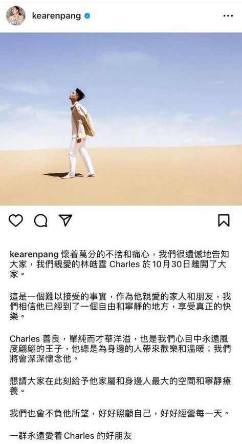 【點新聞報道】寰亞旗下藝人、主力於時尚界發展的林皓霆(Charles),於10月30日在北角一賓館燒炭自殺,終年35歲。寰亞發聲明交代,證實林皓霆離世消息。Charles好友及導演彭秀慧分別在社交網發文悼念。