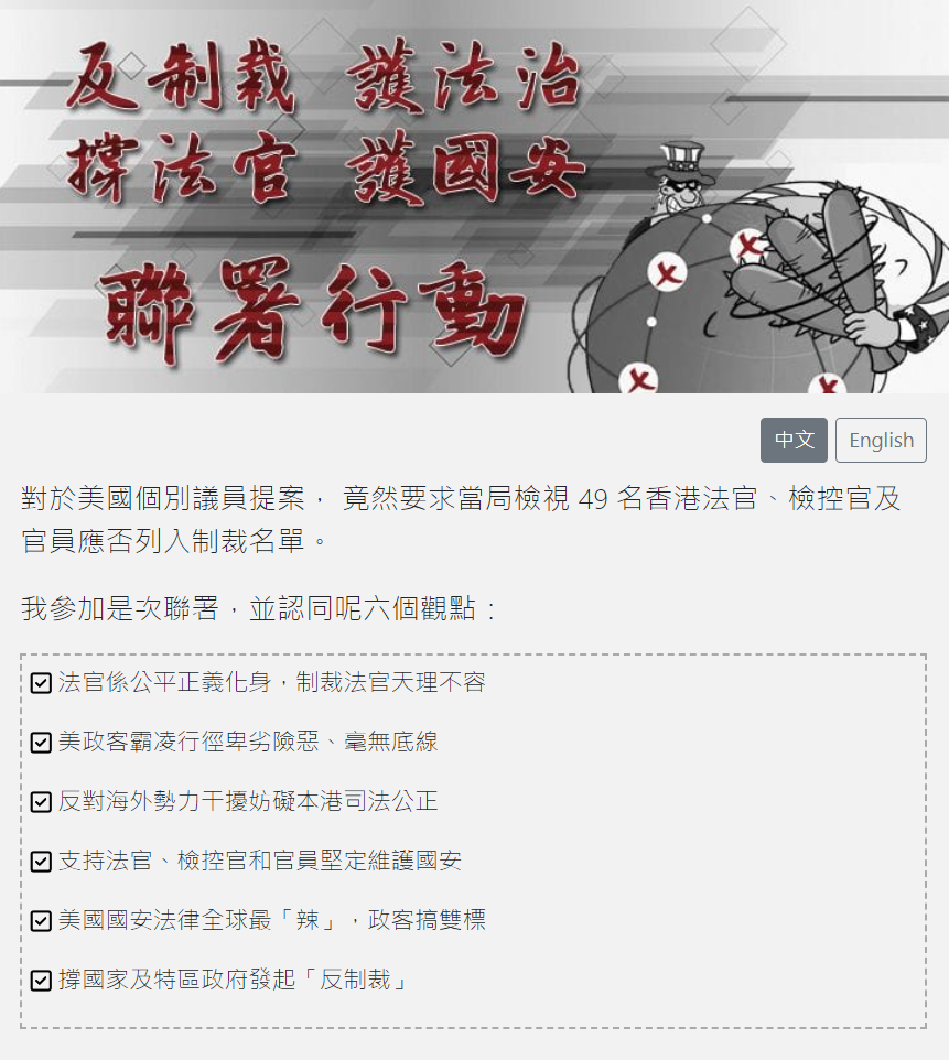 有網民成立關注組,在網上發起「反制裁 撐法官 護法治 護國安」聯署行動(詳情點擊此處鏈接),反對美國國會個別政客拋出所謂「香港制裁法案」,叫囂制裁本港法官、檢控官及官員。聯署列出六大觀點:法官係公平正義化身,制裁法官天理不容;美政客霸凌行徑卑劣險惡、毫無底線;反對海外勢力干擾妨礙本港司法公正;支持法官、檢控官和官員堅定維護國安;美國國安法律全球最「辣」,政客搞雙標。撐阿爺和特區政府發起「反制裁」等。