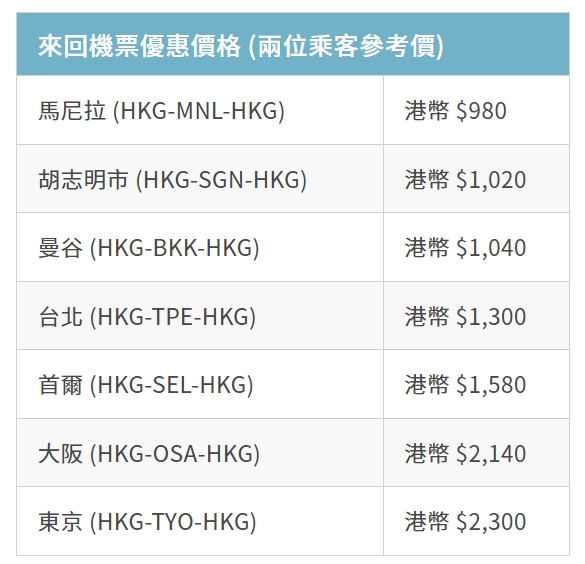 是次優惠須最少二人同行,停留日數多達7天。票價已包括每程7公斤手提行李及10公斤託運行李限額,以滿足旅客所需。乘客如有需要,亦可額外購買託運行李限額。