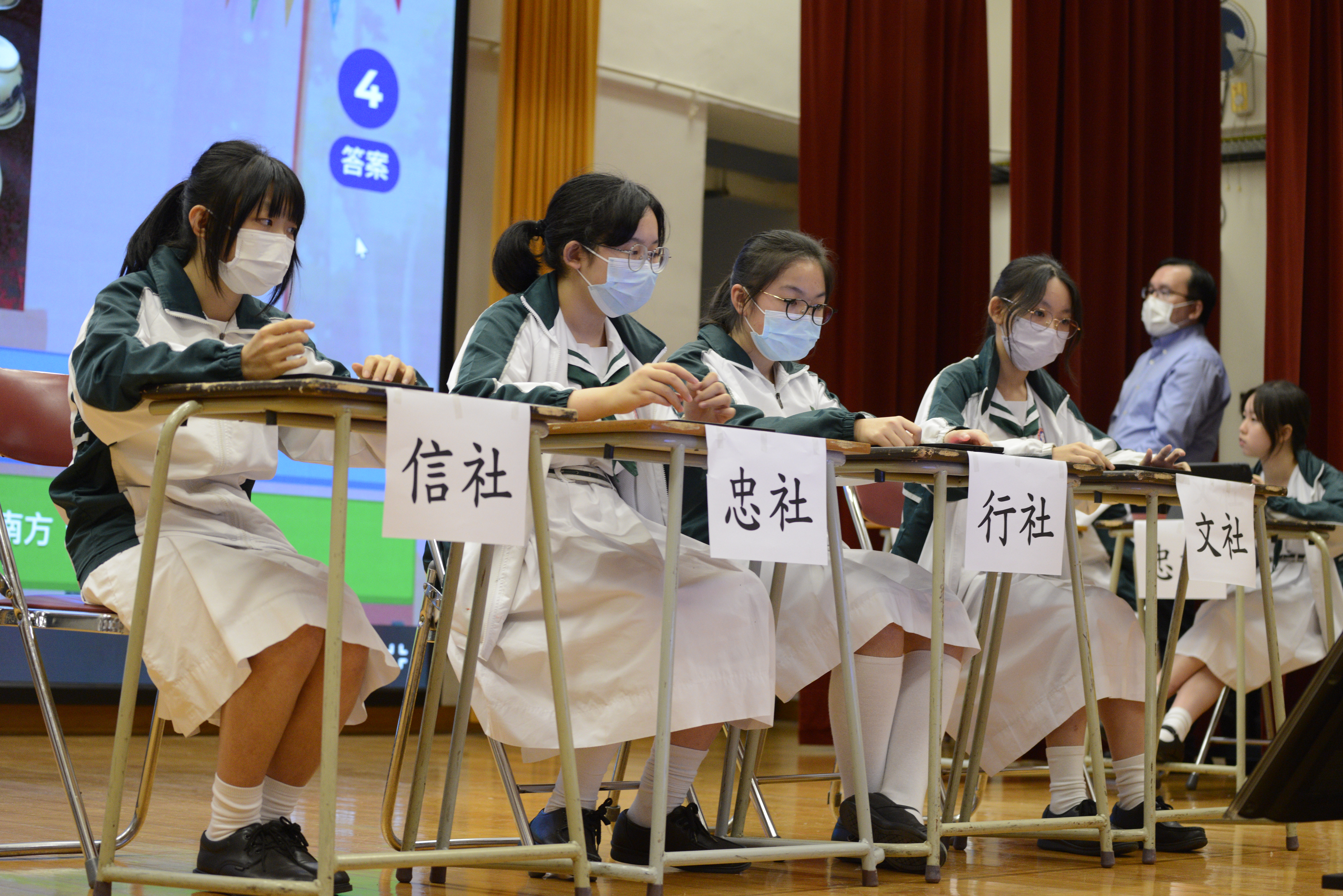 另一邊廂,文狀元的比試同樣精彩,各社參賽隊員齊集禮堂台上,手持平板電腦回答題目。比賽的內容範圍廣泛,包含了中華文化、地理、歷史、數學和國家安全教育等知識。坐在台下的同學也不閒着,部分同學一起答題,在心裏為答題錯誤感到惋惜;有部分同學落力為社打氣;還有部分同學陷入天人交戰,不知道該為社打氣,還是為好朋友打氣,全情投入在活動之中。