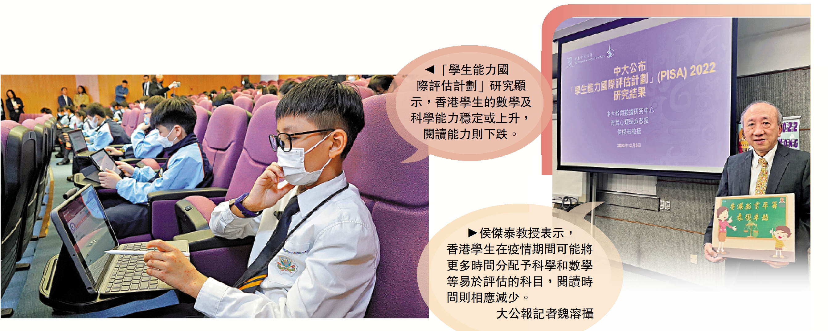 中大教育數據研究中心教育心理學系教授侯傑泰表示,本次評估正值香港從第五波疫情中復原期間,當時香港中學只維持半日授課,令學生閱讀成績受到影響,但香港的整體成績依舊名列前茅。此外,本港學校在疫情停課期間為學生提供有效支援,香港學生每天參加線上課程的比例達75%,明顯高於OECD的平均水平(51%)。