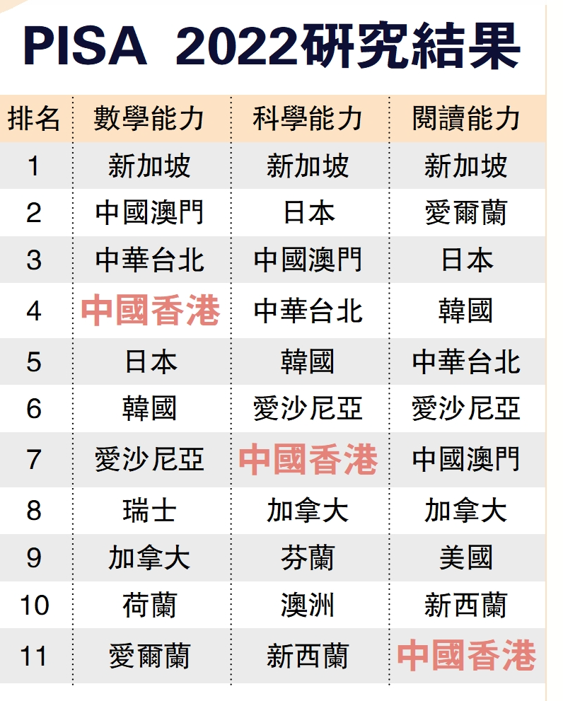 研究結果顯示,香港15歲學生的成績與2018年相比,數學成績跌11分,繼續排第4位,科學成績升3分,由第9位升至第7位;而閱讀成績則下跌24分,由第4位跌至第11位,為香港參與PISA研究以來首次跌出前十名。