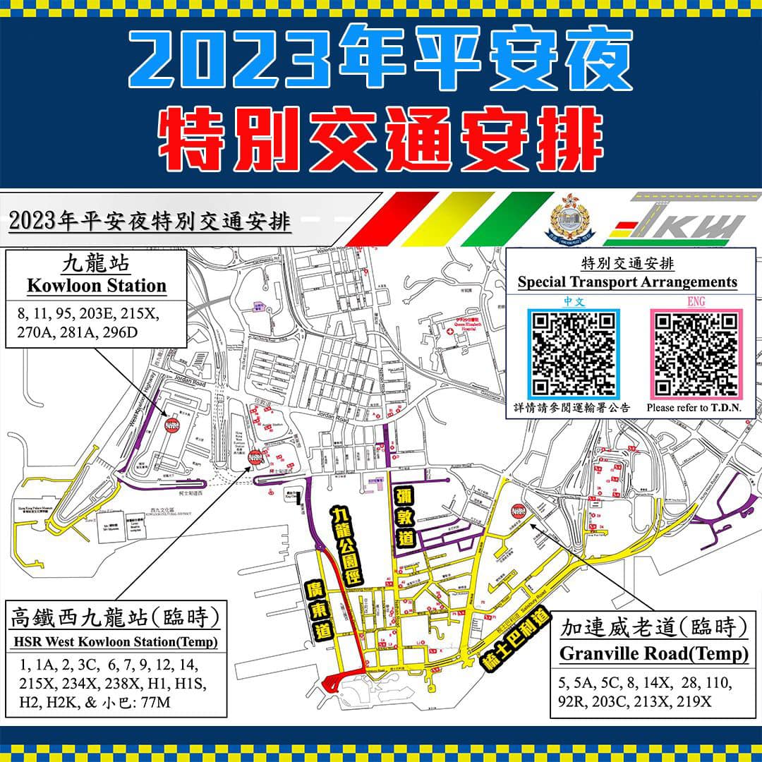 中環蘭桂坊、尖沙咀及西九文化區一帶在平安夜下午2時開始,分階段實施封路及交通改道安排;尖沙咀東(麼地道)巴士總站及中港碼頭巴士總站會由當日晚上6時開始暫停使用,而尖沙咀天星碼頭巴士總站亦會由晚上6時30分開始暫停使用,直至封閉道路重開並恢復行車為止。為配合封路安排,行經受影響地區的巴士及專線小巴路線會臨時改道或暫停服務,而位於受影響地區的相關巴士站及專線小巴站,亦需暫停使用或遷移。