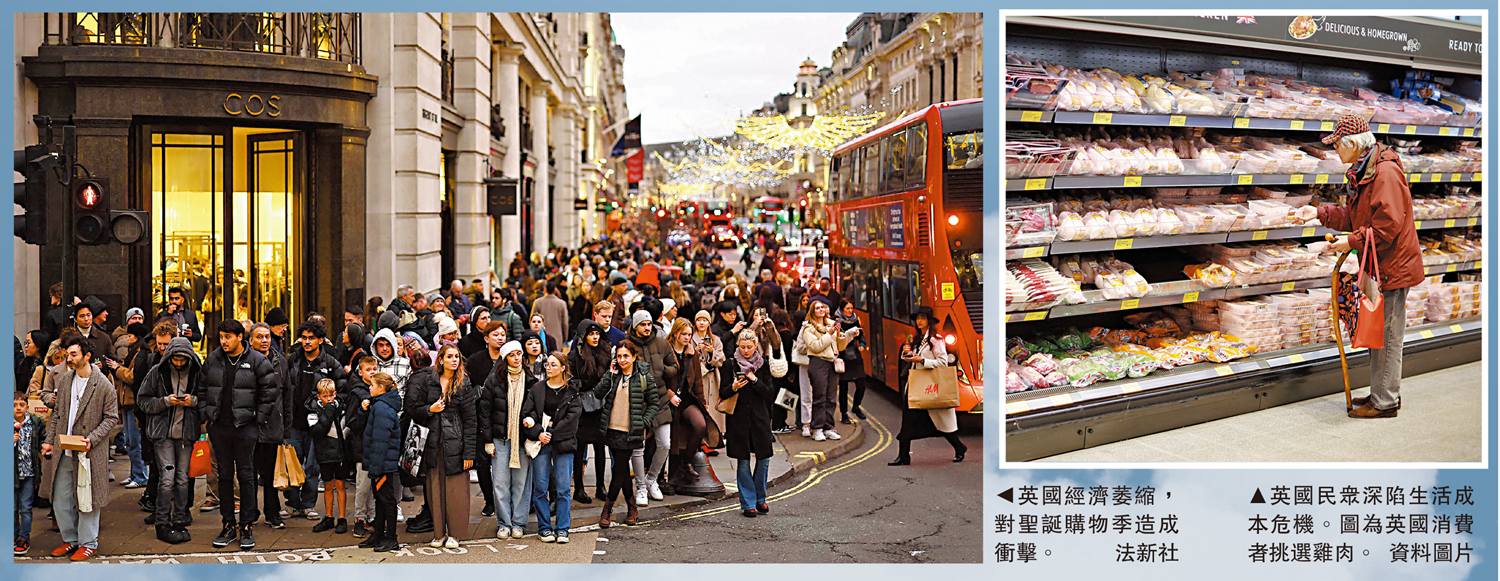 英國國家統計局22日公布的最新數據顯示,英國經濟在第三季度出現萎縮,國內生產總值(GDP)下降了0.1%。潘森宏觀首席英國經濟學家塞繆爾·圖姆斯表示,借貸成本飆升促使英國家庭和企業削減開支,拖累了第三季度的GDP。經濟學家期盼聖誕季消費為低迷的英國經濟帶來一絲曙光,但慈善機構StepChange委託輿觀(YouGov)進行的民調顯示,經歷長達兩年的生活成本危機之後,多達四分之一的英國民眾擔憂自己無法承擔節日的額外開銷;三分之一的有子女家庭可能過不起聖誕節。