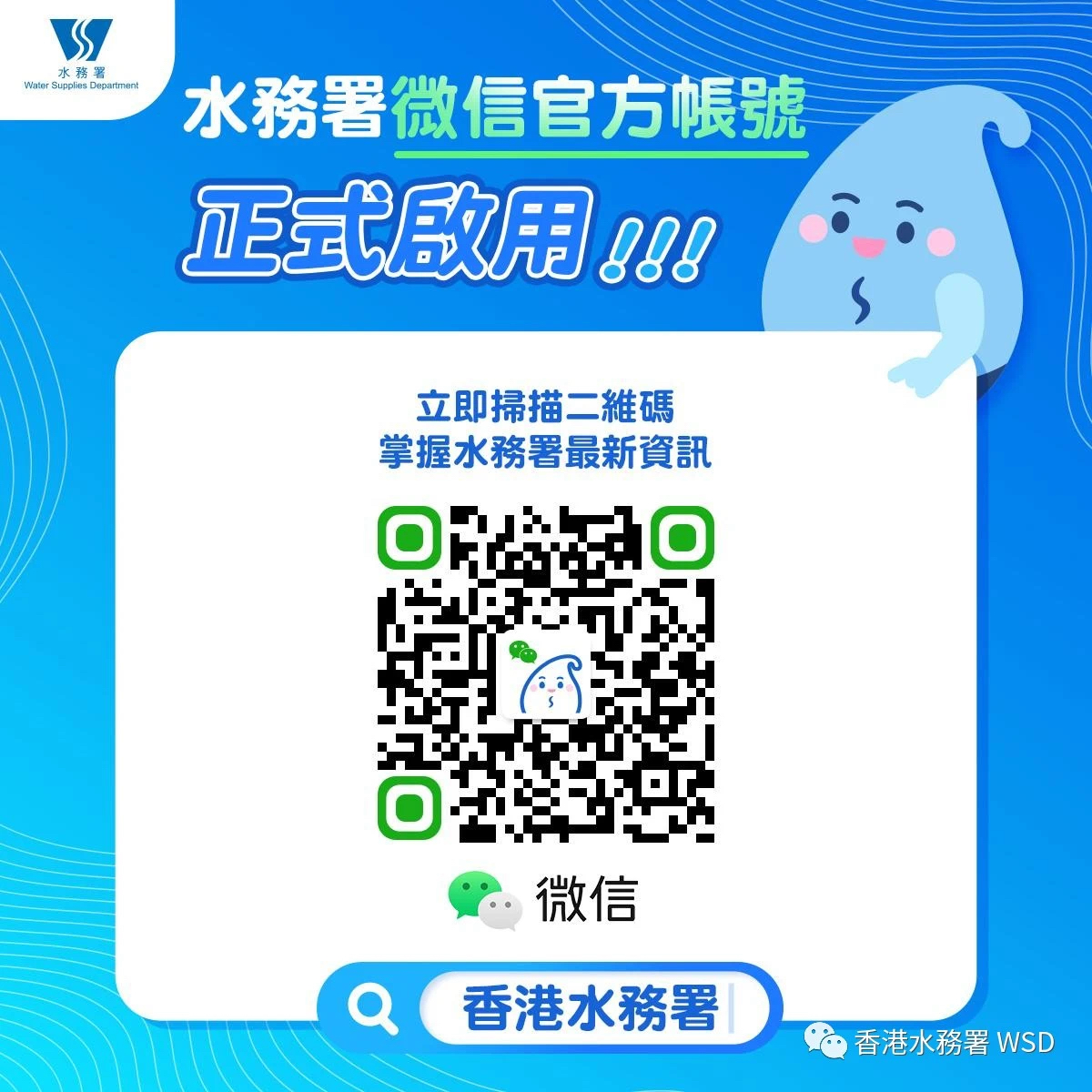 繼開設Facebook專頁、Instagram賬戶和YouTube頻道後,水務署開設微信官方賬號,透過此平台發布有關水務署多元化工作的最新資訊,推廣水務署專業形象,並讓公眾掌握更多有用的水務資訊,亦希望「香港水務署」的資訊更廣泛地讓香港、內地及其他地區民眾了解。