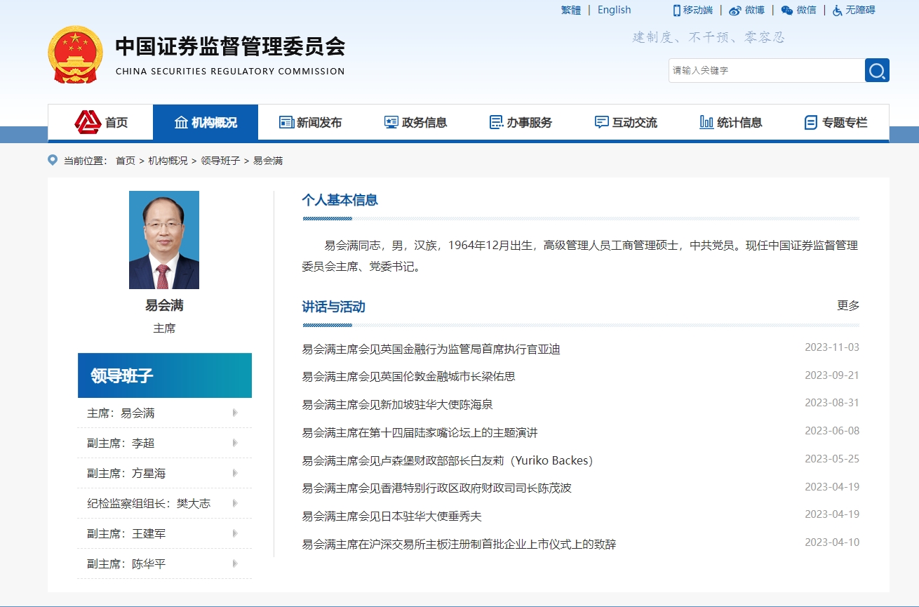 點新聞記者查詢發現,中國證監會網站尚未更新「領導班子」信息。目前中國證監會主席為吳清,副主席有四位,分別是李超、方星海、王建軍、陳華平,紀檢監察組組長為樊大志。
