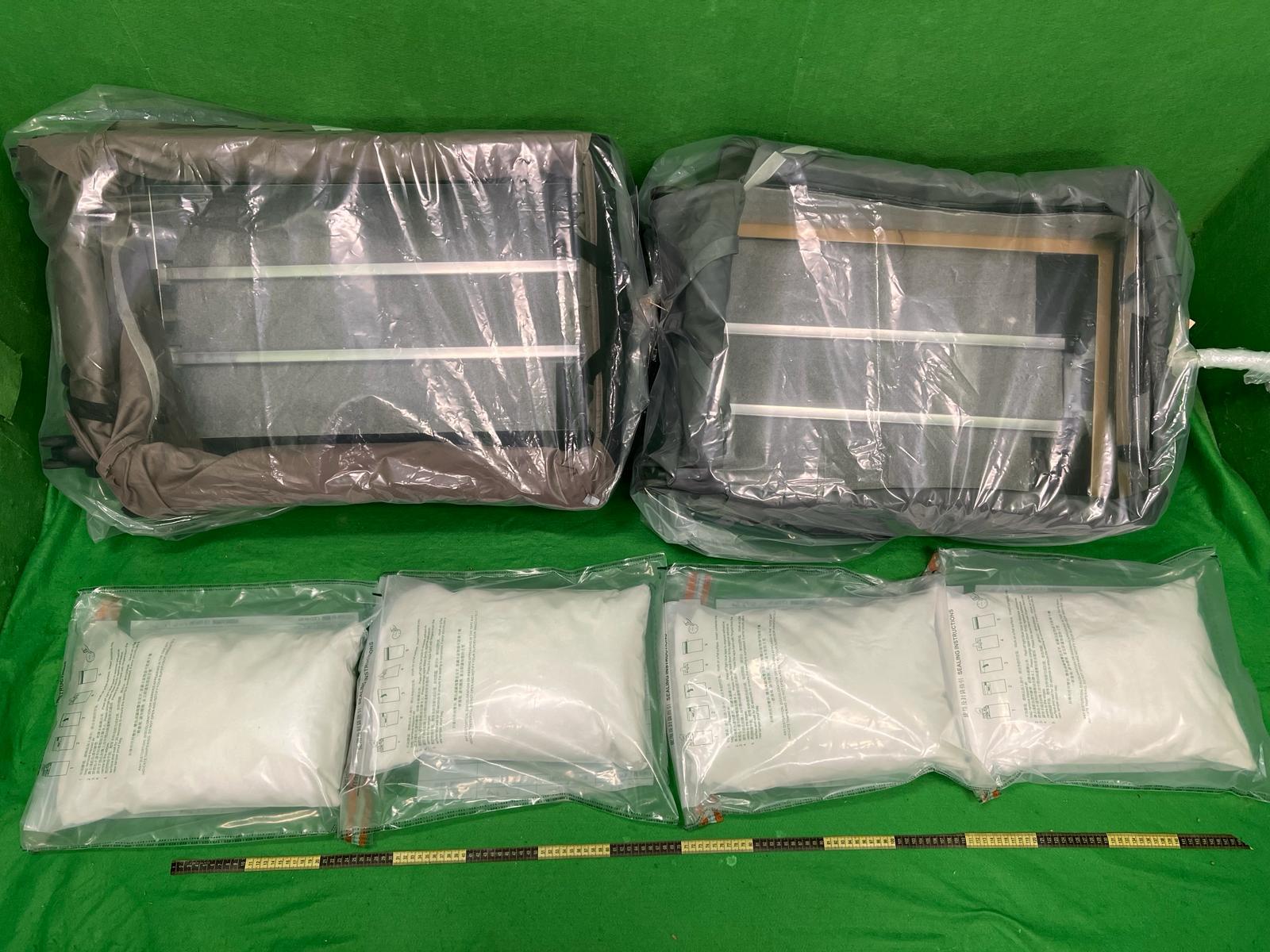 一名25歲男旅客和一名25歲女旅客昨日從德國法蘭克福飛抵本港。海關人員替他們清關時,在兩人的寄艙行李內的夾層內檢獲該批懷疑氯胺酮,遂把他們拘捕。案件仍在調查中。