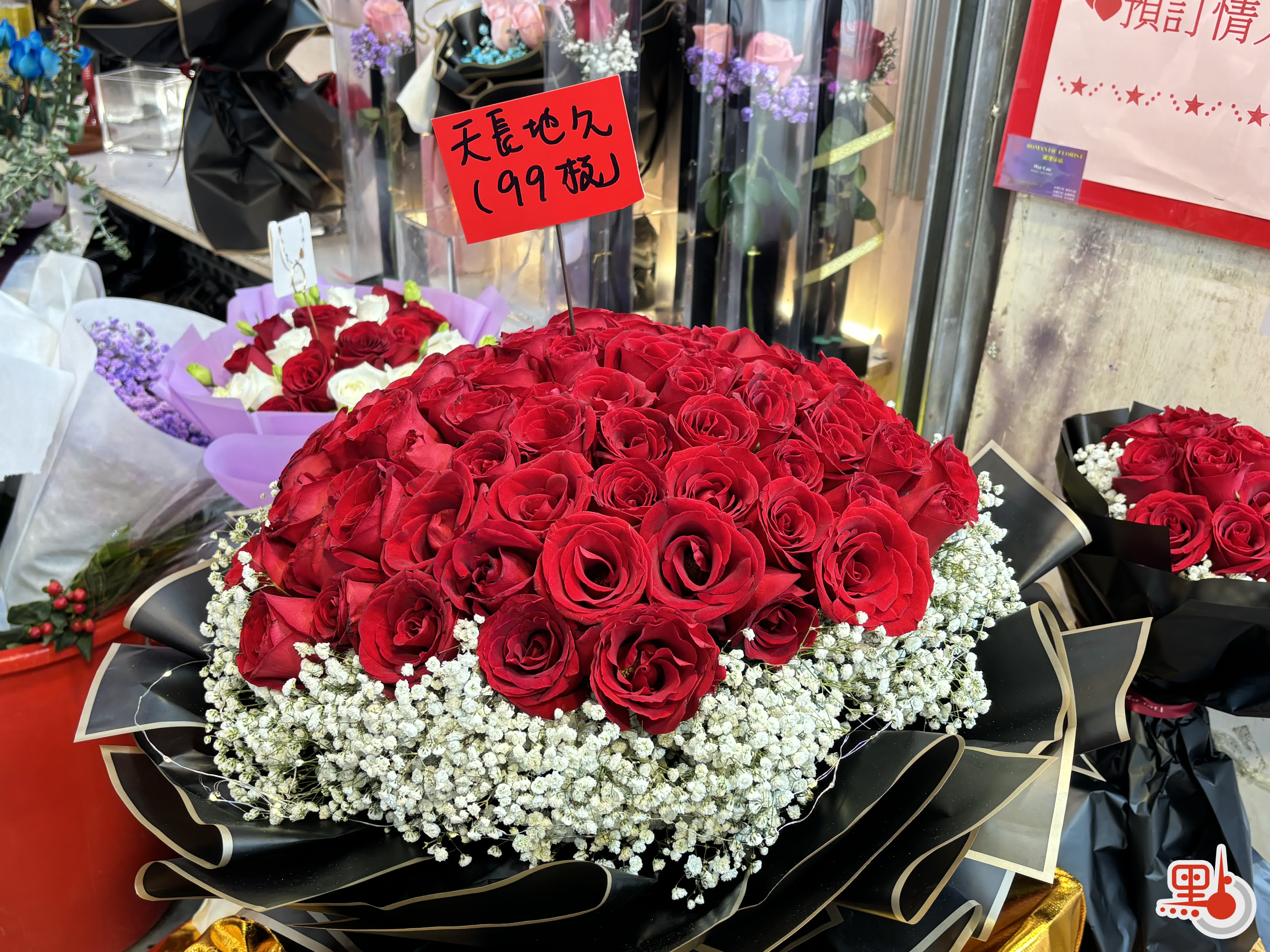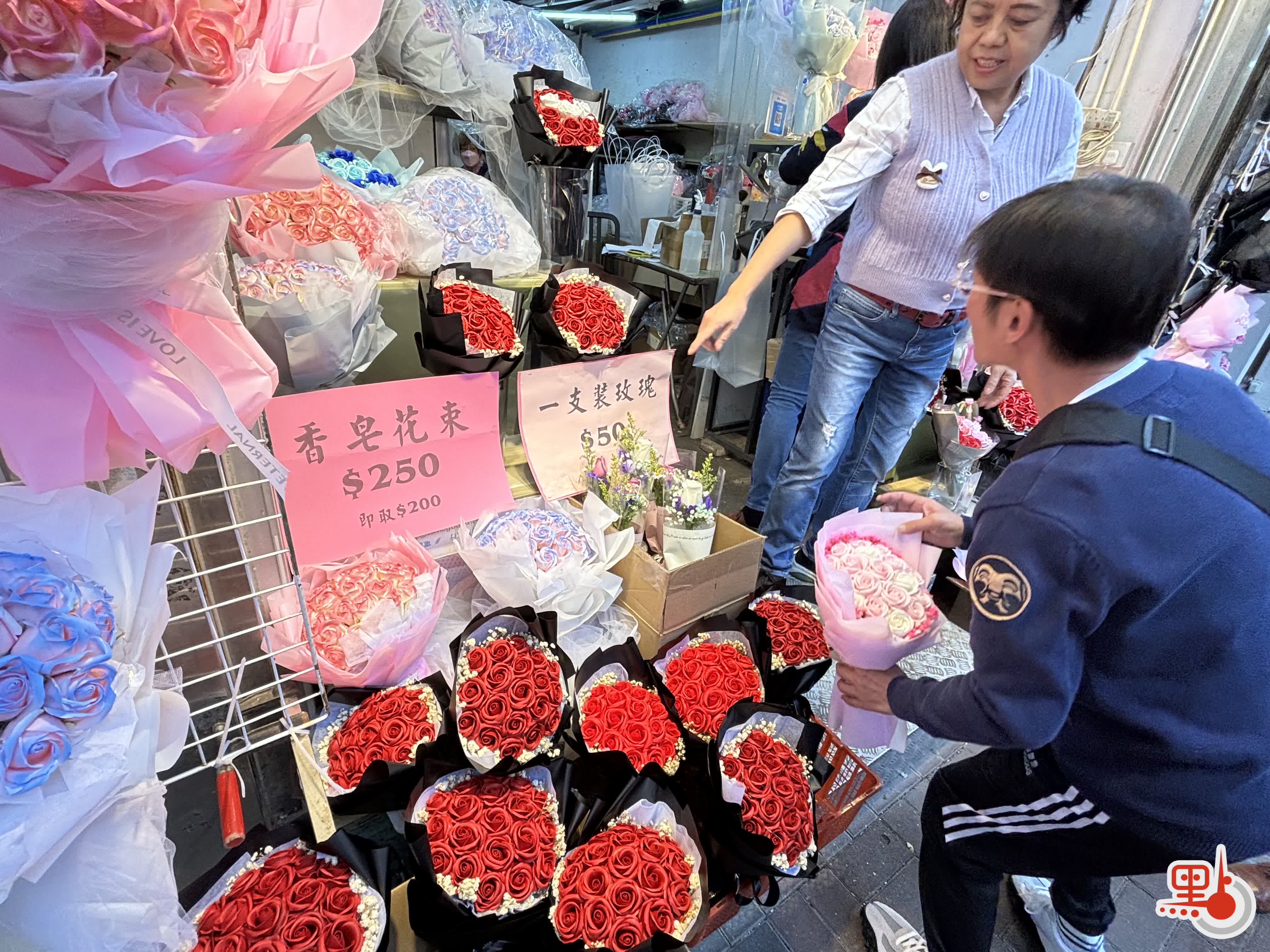關於花束價格,則是豐儉由人。不僅有象征「天長地久」的99枝紅玫瑰,也有店舖推出單只玫瑰花,包裝都同樣精美。款式方面,紅玫瑰自然最受歡迎,各款花束價格在500元左右。若是覺得鮮花「不實用」,亦可購買香皂花束,價格亦更平宜,不過並非市民最佳選擇。