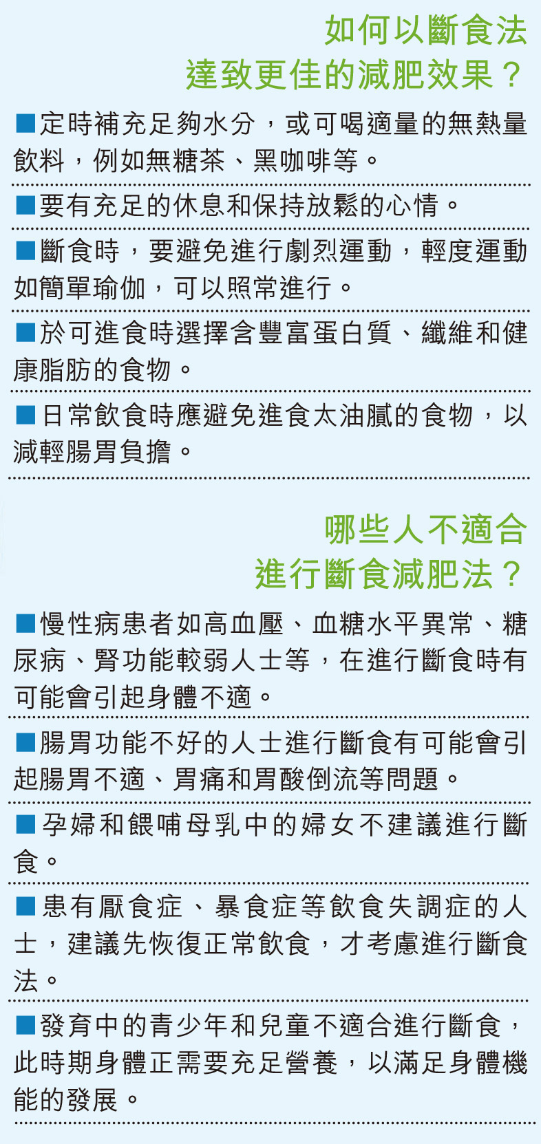 【點新聞報道】內地勵志電影《熱辣滾燙》,票房率先衝破10億人民幣,不僅火爆了春節檔,更讓「賈玲式減肥」成了人們熱議的話題。很多人在欣賞電影之餘,更受內地女演員賈玲(在電影中飾演拳擊手)一年減重100斤的激勵,重新走進健身房、跳上跑步機,也準備開始一段「暴風式」的減肥之旅。坊間流傳很多不同類型的減肥方法,而近年較盛行的斷食減肥法,不少女明星更聲稱藉此成功瘦身。究竟斷食減肥法是否真的能有效地長期減重?消委會早前拆解3種比較常見的斷食法。然而,並非所有人都適合斷食,現一文睇清斷食減肥法的原理,以及進行斷食法要注意的地方。
