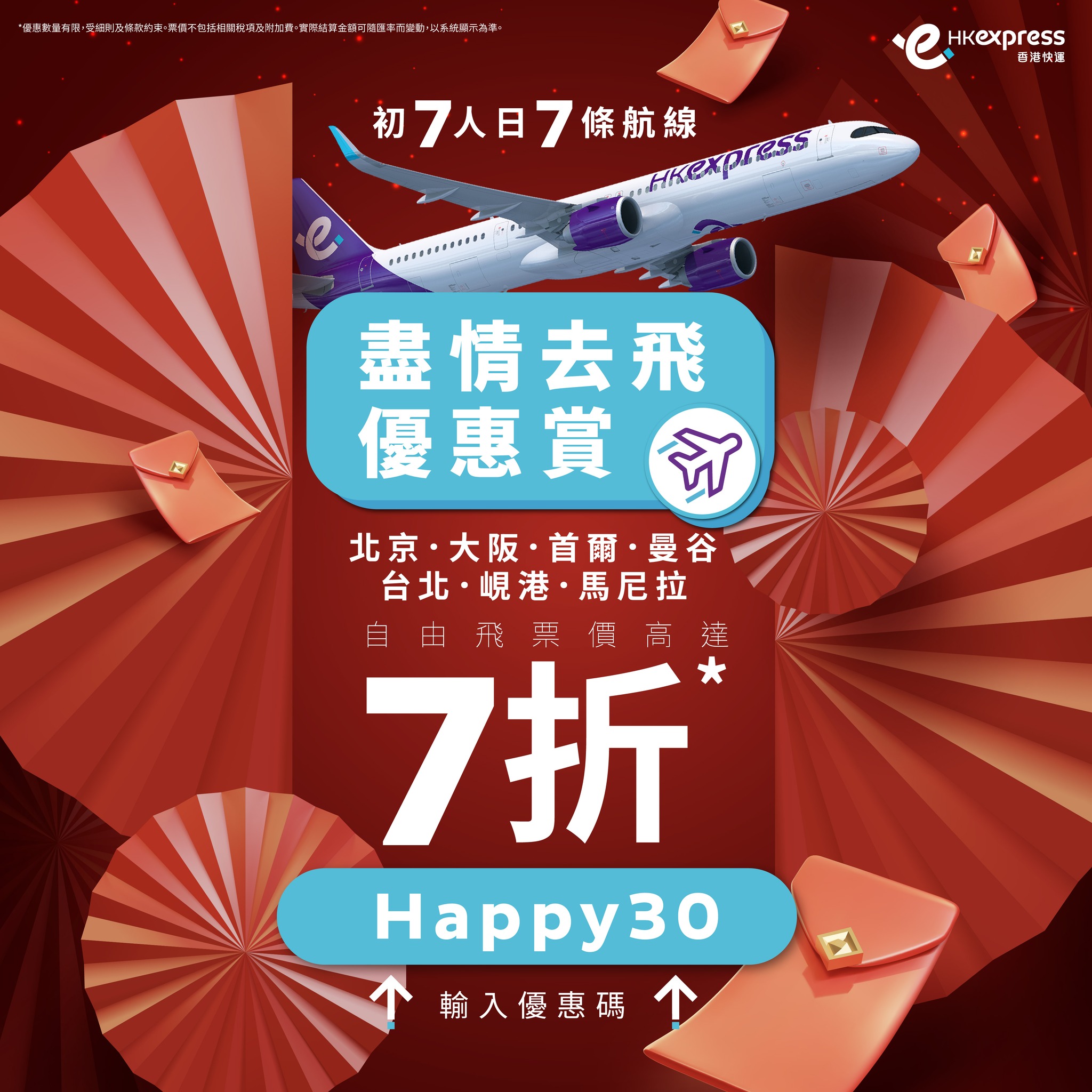 【點新聞報道】今日(16日)是年初七人日,香港快運(HK Express)推出機票優惠,在2月16日至18日,預訂北京、大阪、首爾、曼谷、峴港、台北、馬尼拉的機票(僅適用於「自由飛」票價),並輸入指定優惠碼「Happy30」,即可享高達七折優惠,最平更低至港幣48元。