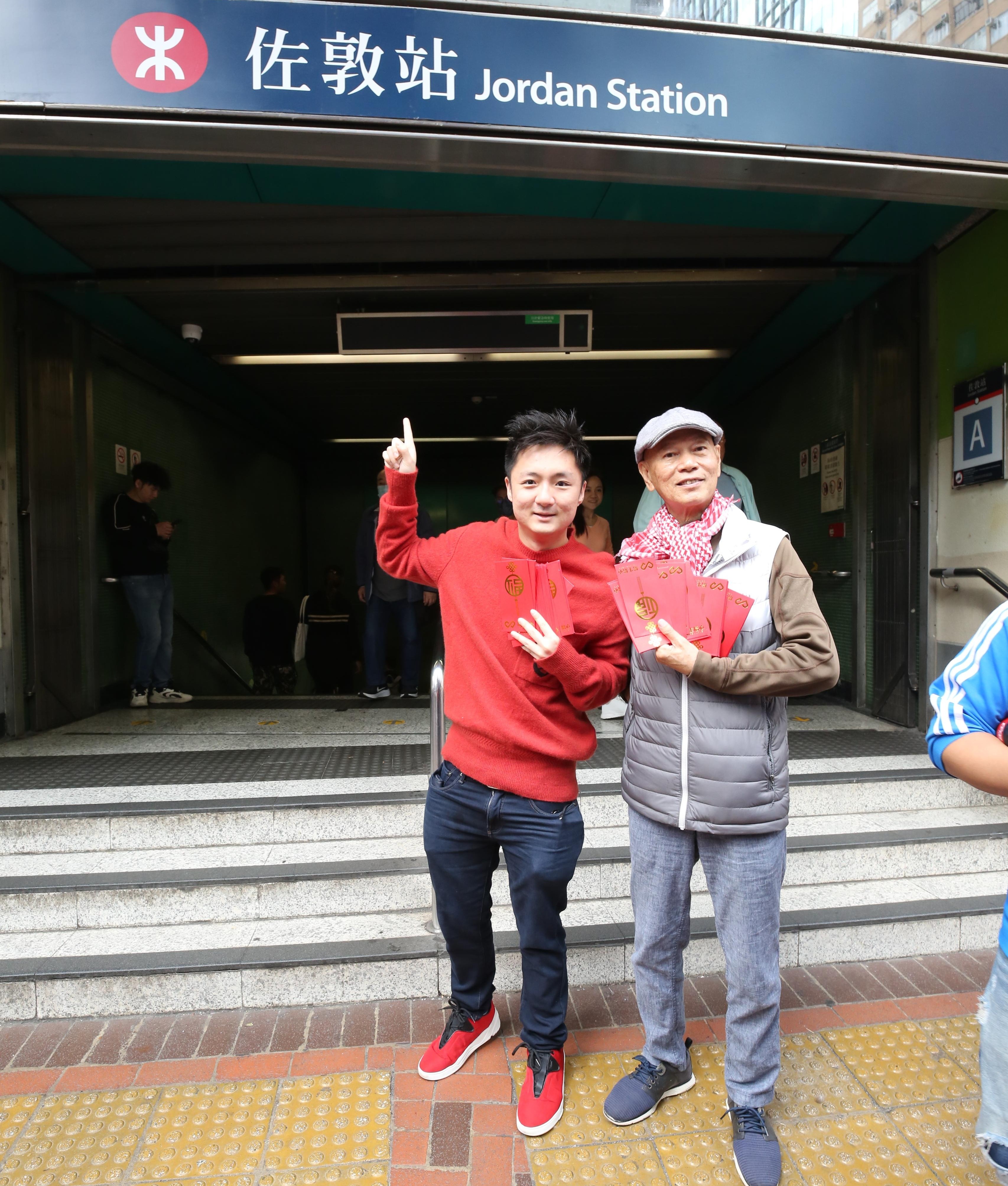 【點新聞報道】繼年初四(13日)鍾培生於銅鑼灣號召50多位俊男美女變身成為「特派員」,一連6小時在街頭大派百元大利是後,今日(18日)更邀請了城中名人羅家英還原電影《龍咁威》中經典劇情——龍大雙(羅家英飾)計劃於佐敦站派錢的橋段,於佐敦站外豪派港幣100元大利是予附近市民。