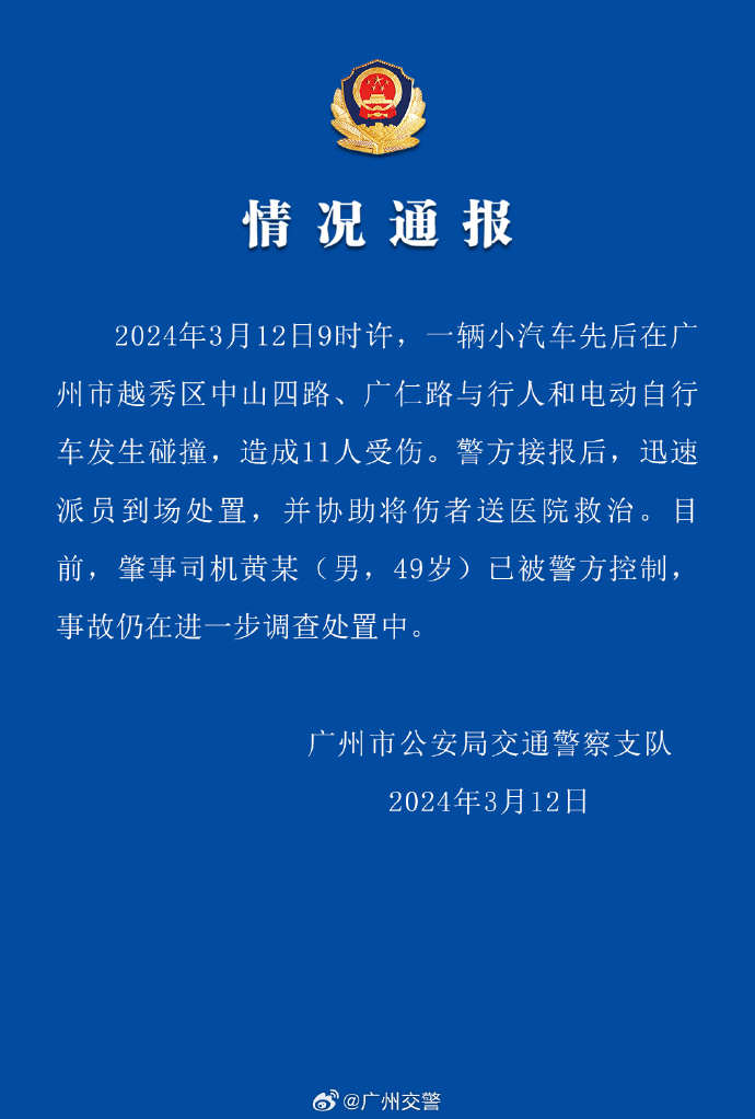 廣州市公安局交通警察支隊通報:2024年3月12日9時許,一輛小汽車先後在廣州市越秀區中山四路、廣仁路與行人和電動單車發生碰撞,造成11人受傷。警方接報後,迅速派員到場處置,並協助將傷者送醫院救治。目前,肇事司機黃某(男,49歲)已被警方控制,事故仍在進一步調查處置中。