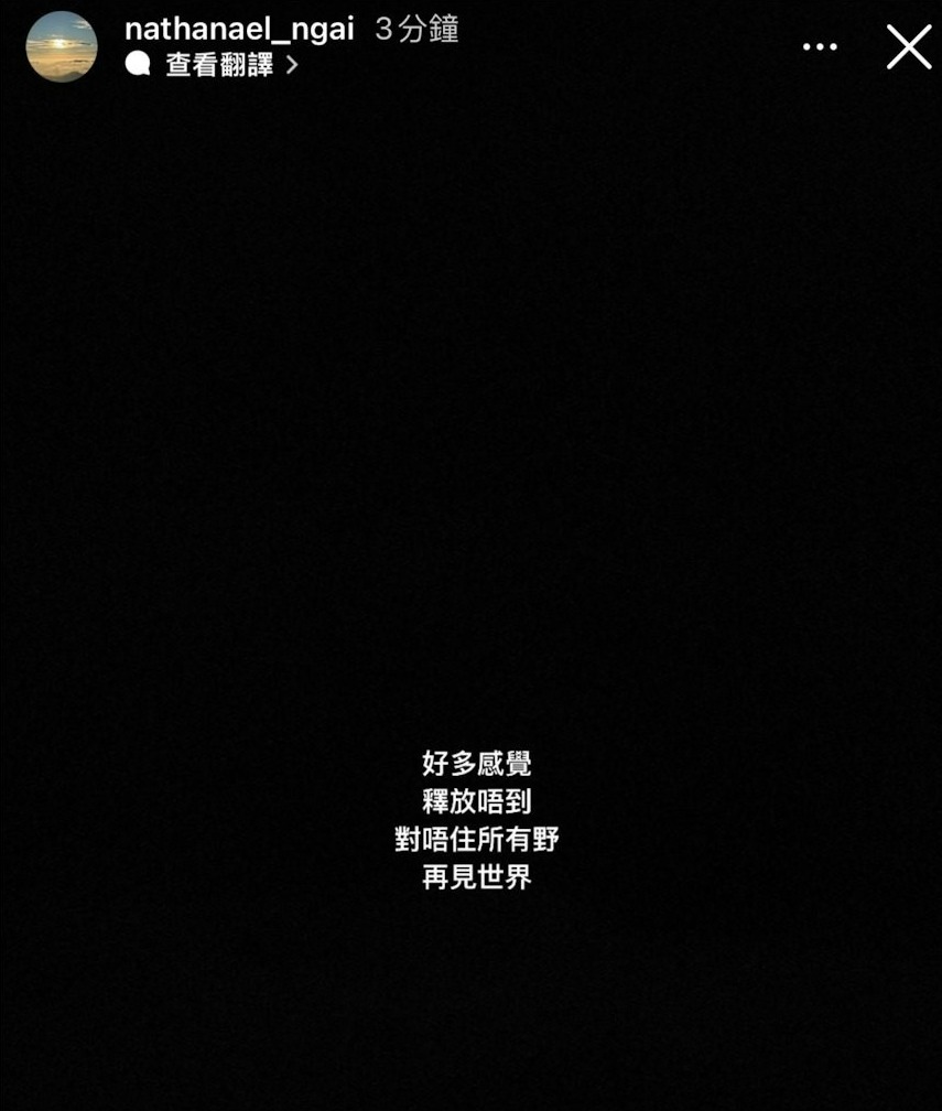 Nathan此前參加《全民造星V》晉身十強,惟負面新聞纏身,最終於總決賽半小時前宣布退賽,此後一直未有更新社交媒體。他早前擔任陳蕾演唱會表演嘉賓,疑為復出試水,之後卻傳出與COLLAR成員Day拍拖緋聞。直到今日凌晨,Nathan在限時動態出黑po,稱「好多感覺 釋放唔到 對唔住所有野(嘢) 再見世界」,令一眾粉絲擔心。