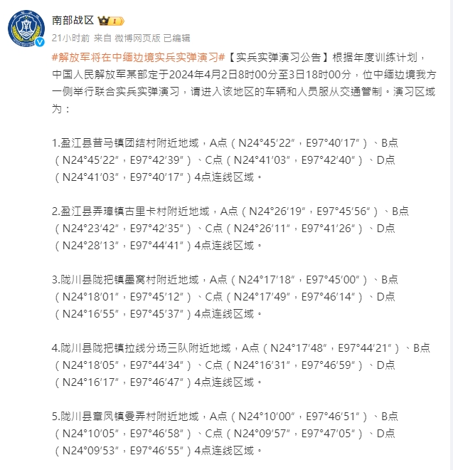 據中國人民解放軍南部戰區社交平台官方賬號昨日發布消息,根據年度訓練計劃,中國人民解放軍某部定於2024年4月2日8時至3日18時,位中緬邊境中方一側舉行聯合實兵實彈演習,請進入該地區的車輛和人員服從交通管制。演習期間,嚴禁無關人員擅自進入演習警戒區,嚴禁各類飛行器進入演習空域,嚴禁私自拍攝部隊行動情況,嚴禁擅自通過各類媒體平台傳播任何演習有關信息。