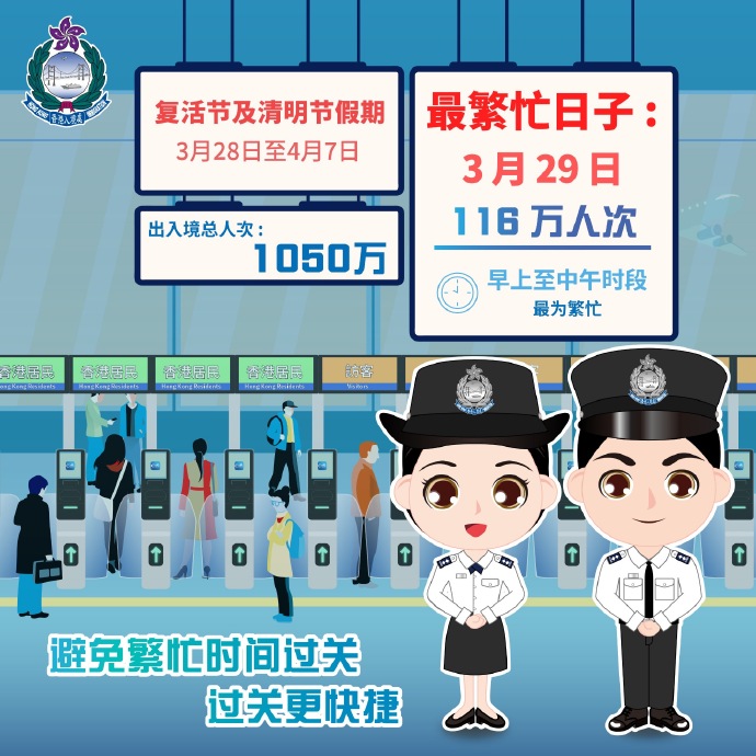 【點新聞報道】香港入境事務處今日(8日)表示,在剛過去的復活節及清明節假期期間(3月28日至4月7日),約1050萬人次經各管制站進出香港,每天平均有超過95萬人次出入境。長假期期間最繁忙的日子是3月29日,當天有超過116萬人次出入境,是自2023年通關以來的新高,當日早上至中午時分是出境高峰期,市民經多個管制站出境都需要較長時間。