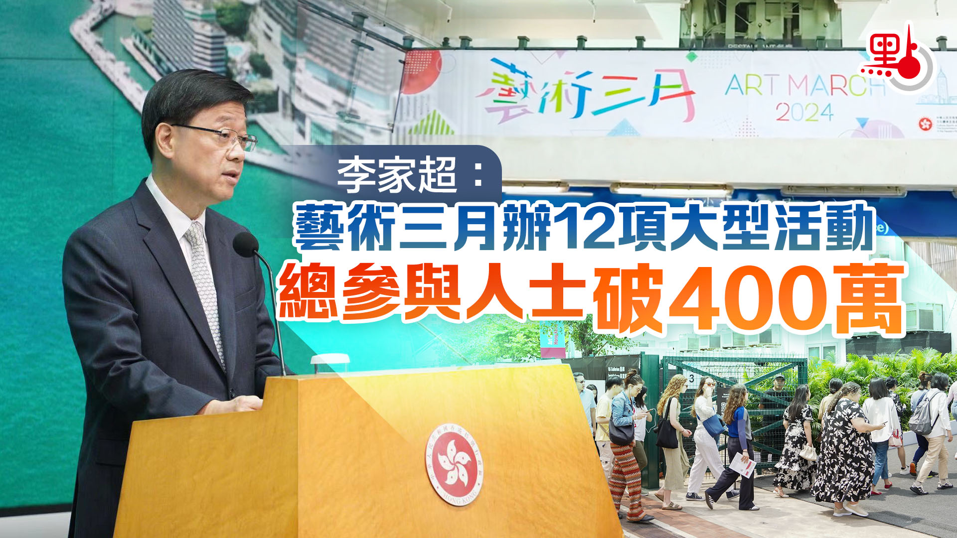 【點新聞報道】行政長官李家超今日(9日)出席行政會議前見記者。他表示,上月的「藝術三月」有十二項大型活動,有藝術展、潮流嘉年華及影視娛樂盛會等,部分活動展期超過一個月,總參與人士突破四百萬。