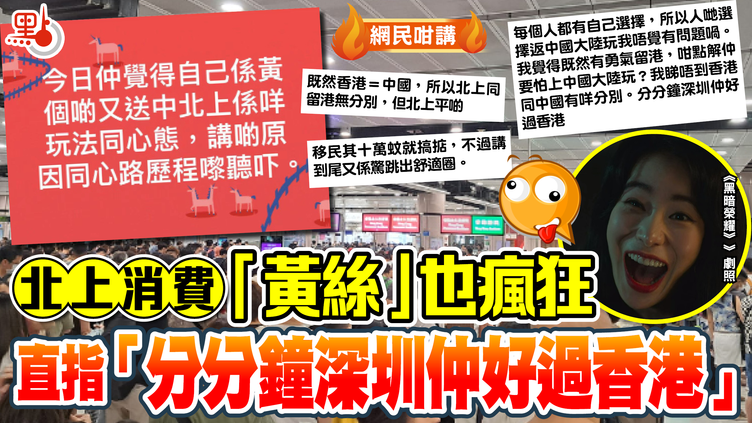 北上消費蔚然成風,就連「黃絲」也為之瘋狂,紛紛加入北上消費的大軍。有網民就好奇他們的選擇原因,遂發文問:「今日仲覺得自己係黃嗰啲又送中北上係咩玩法同心態」。有網民留言表示,「我睇唔到香港同內地有咩分別。分分鐘深圳仲好過香港」、「既然香港=中國,所以北上同留港無分別,但北上平啲」。