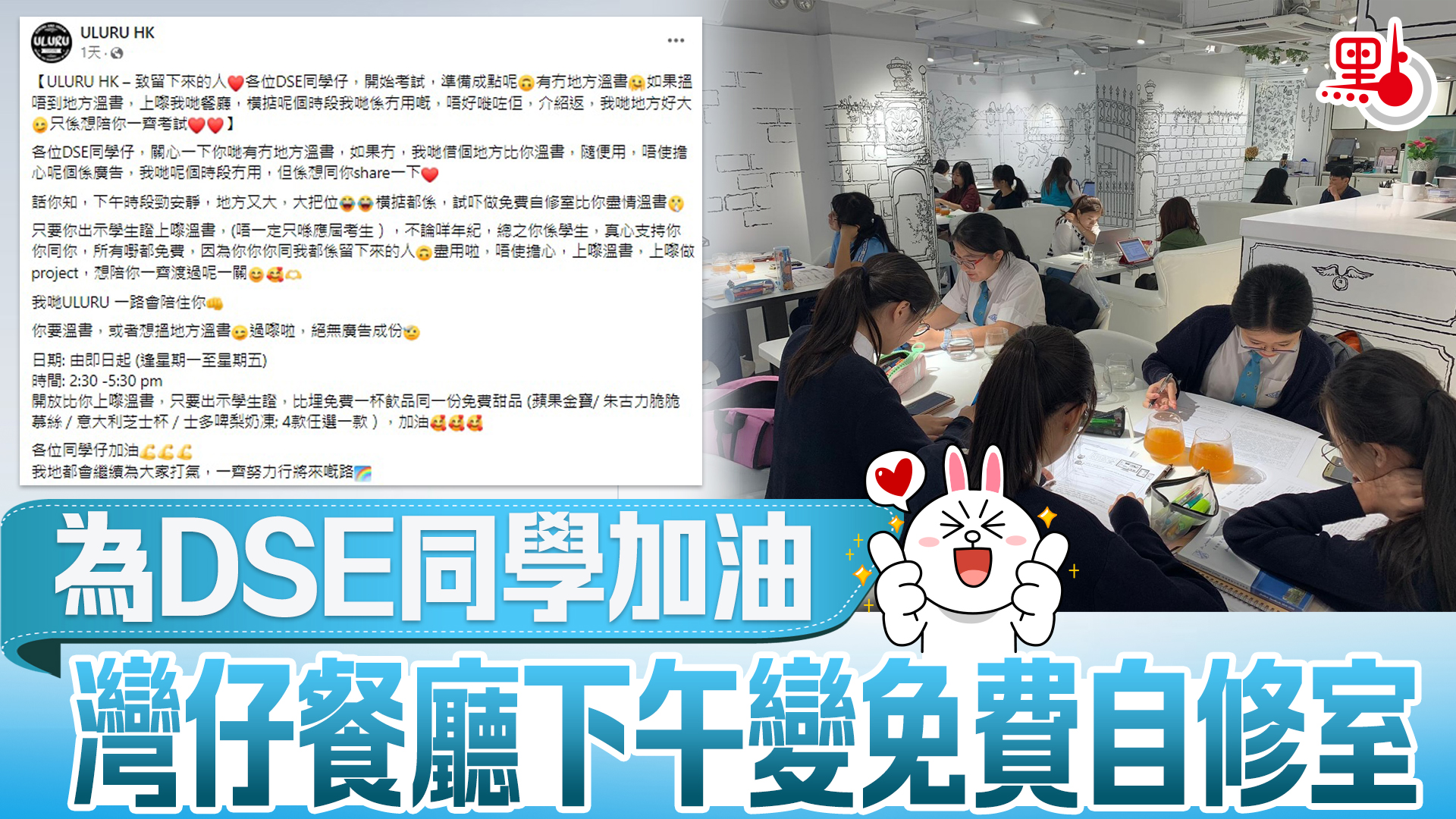 餐廳「ULURU」在社交平台發文表示,「各位DSE同學仔,關心一下你哋有冇地方溫書,如果冇,我哋借個地方比你溫書」,指「下午時段勁安靜,地方又大,大把位橫掂都係,試吓做免費自修室比你盡情溫書只要你出示學生證上嚟溫書」,另外不論任可年紀只要出示學生證更可獲得免費飲品及甜品。