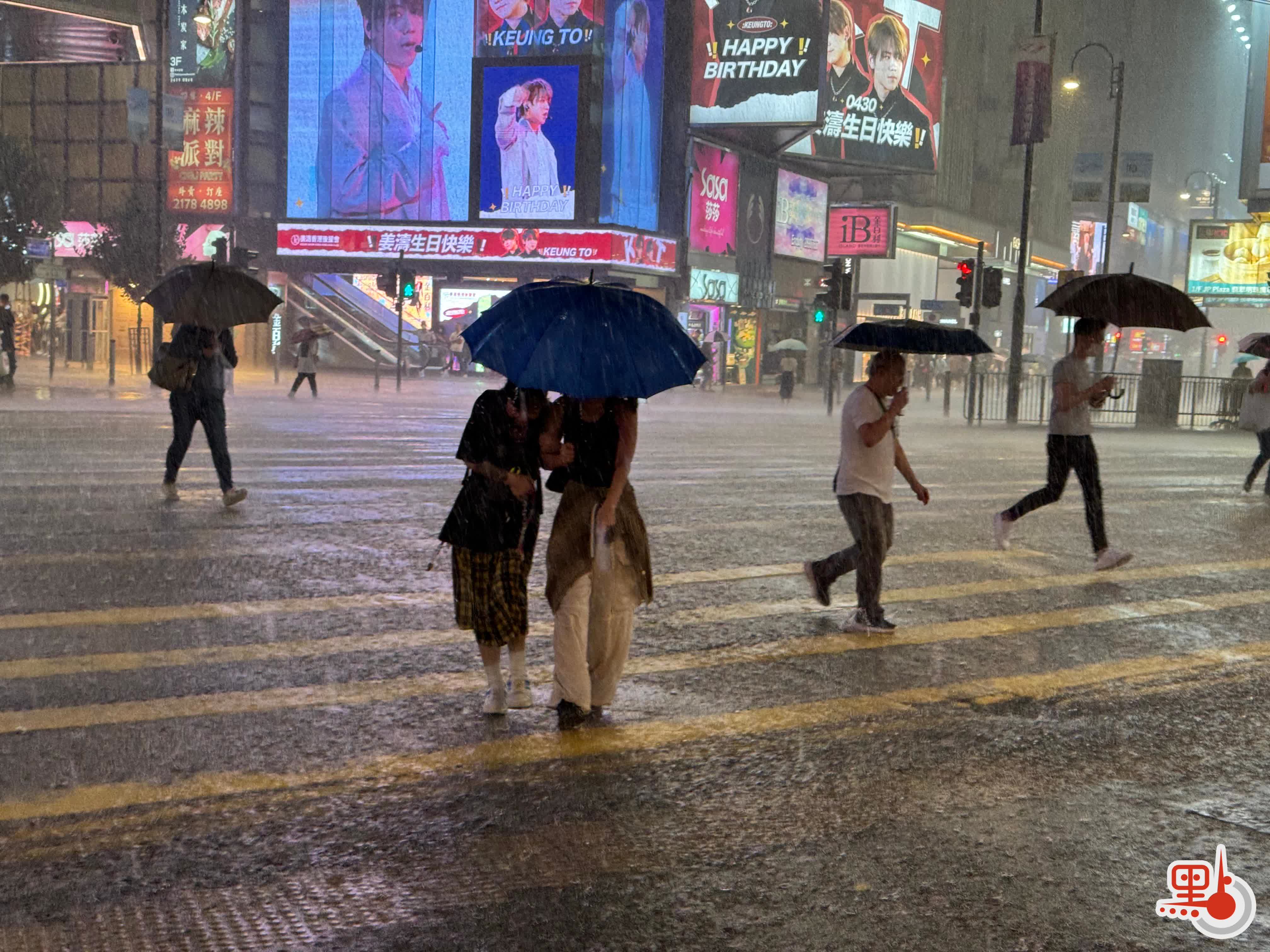 黃雨生效下,晚上在銅鑼灣的行人撐傘顯得非常狼狽,人流亦較以往周末少。