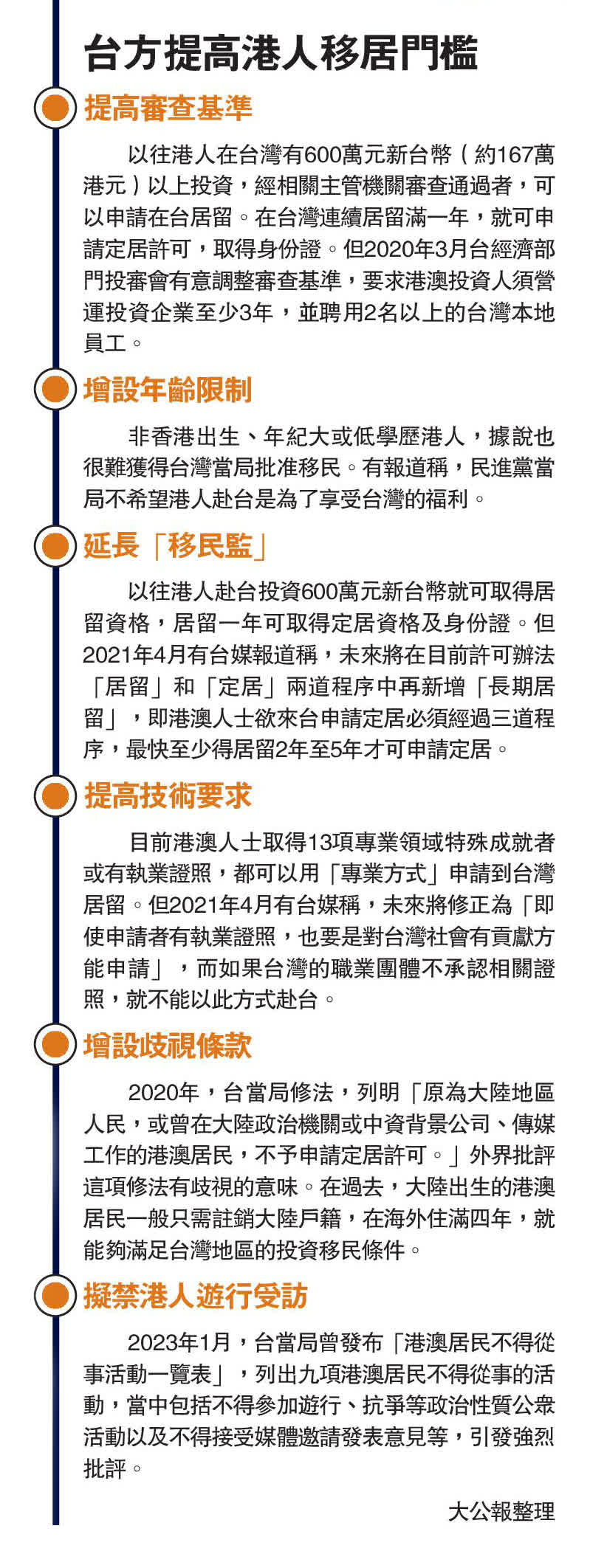 據台媒報道,港人移民來台包括就學、依親及投資等途徑,其中投資移民是港人來台定居的重要渠道。乍看之下,港人投資移民的門檻比外國人低,但實際上往往「看得到、吃不到」。