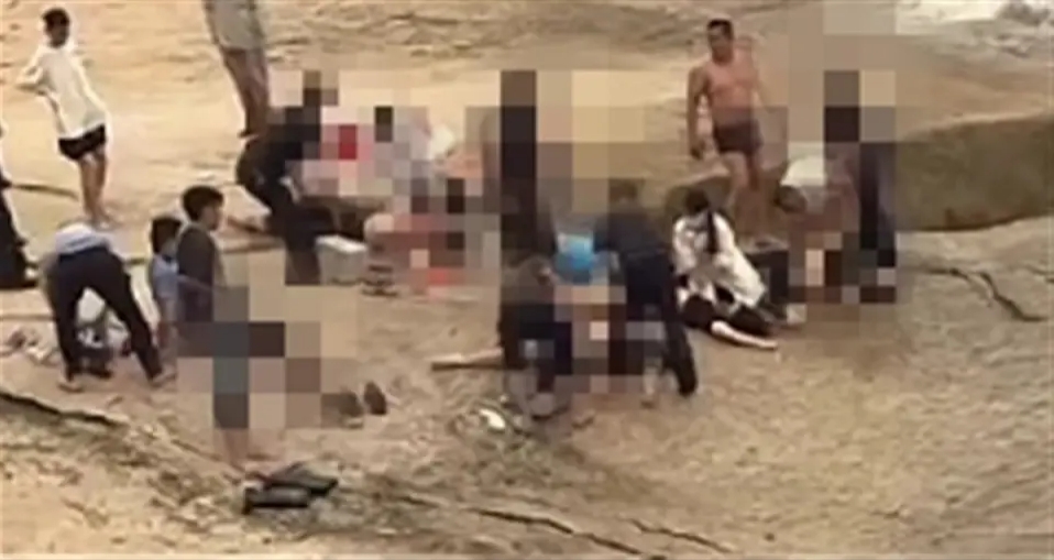 現場視頻顯示,在一海灘上,有幾人躺在沙灘上一動不動,旁邊有人正在對其中一名躺在地上的人做心肺復甦。