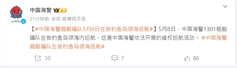 【點新聞報道】據央視網消息,5月8日,中國海警1301艦艇編隊在我釣魚島領海內巡航。這是中國海警依法開展的維權巡航活動。