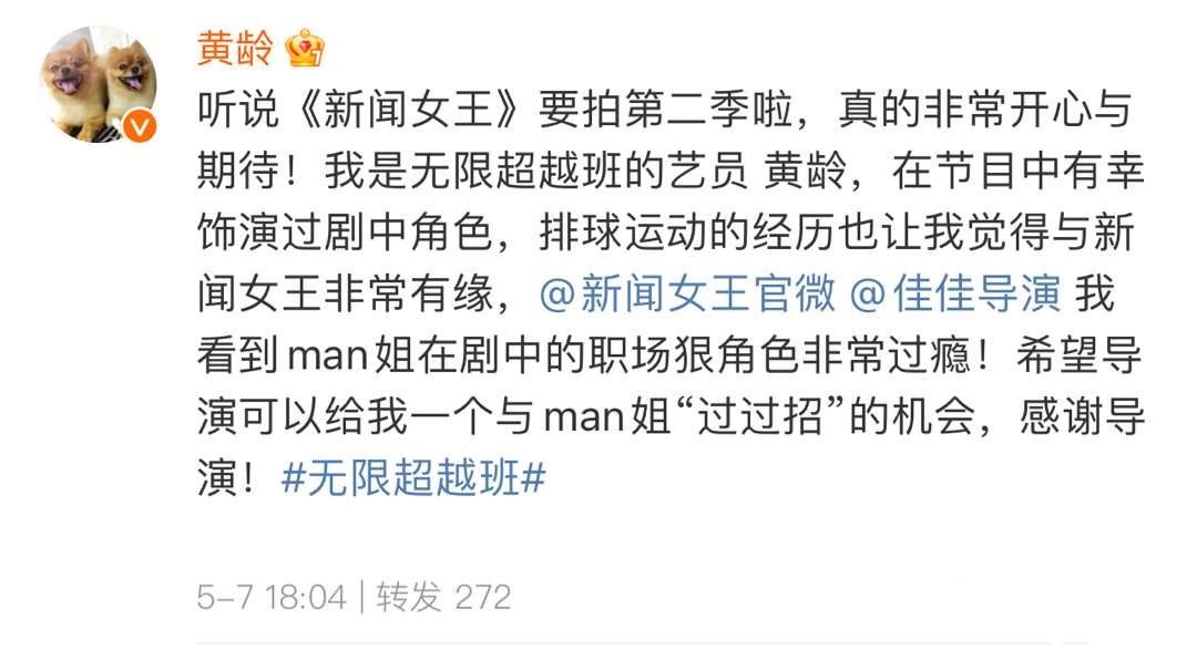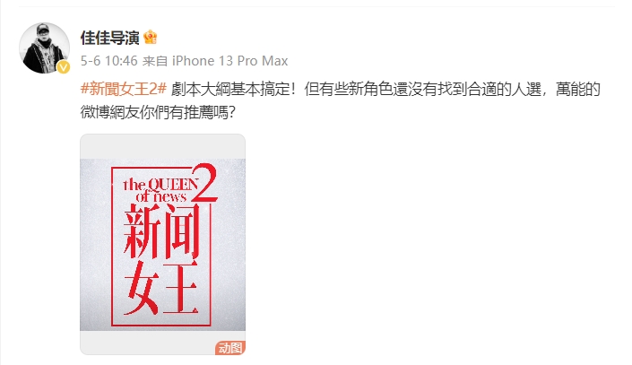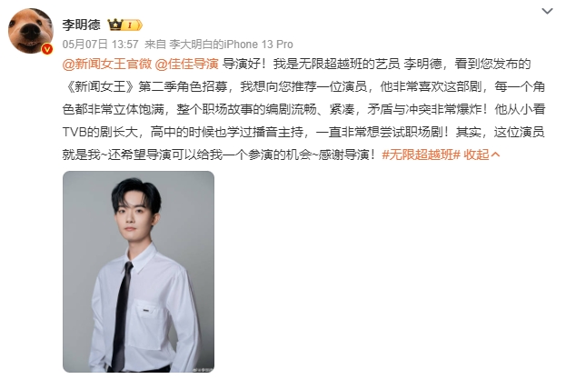 李明德也發微博「求職」,表達自己對《新聞女王》的喜愛,也很想嘗試職場戲。