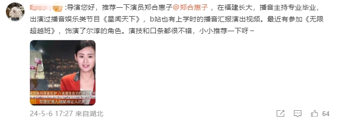 其次,是演員鄭合惠子。播音主持專業畢業的她,出演過播音娛樂類節目《星聞天下》,最近又參加《無限超越班》;