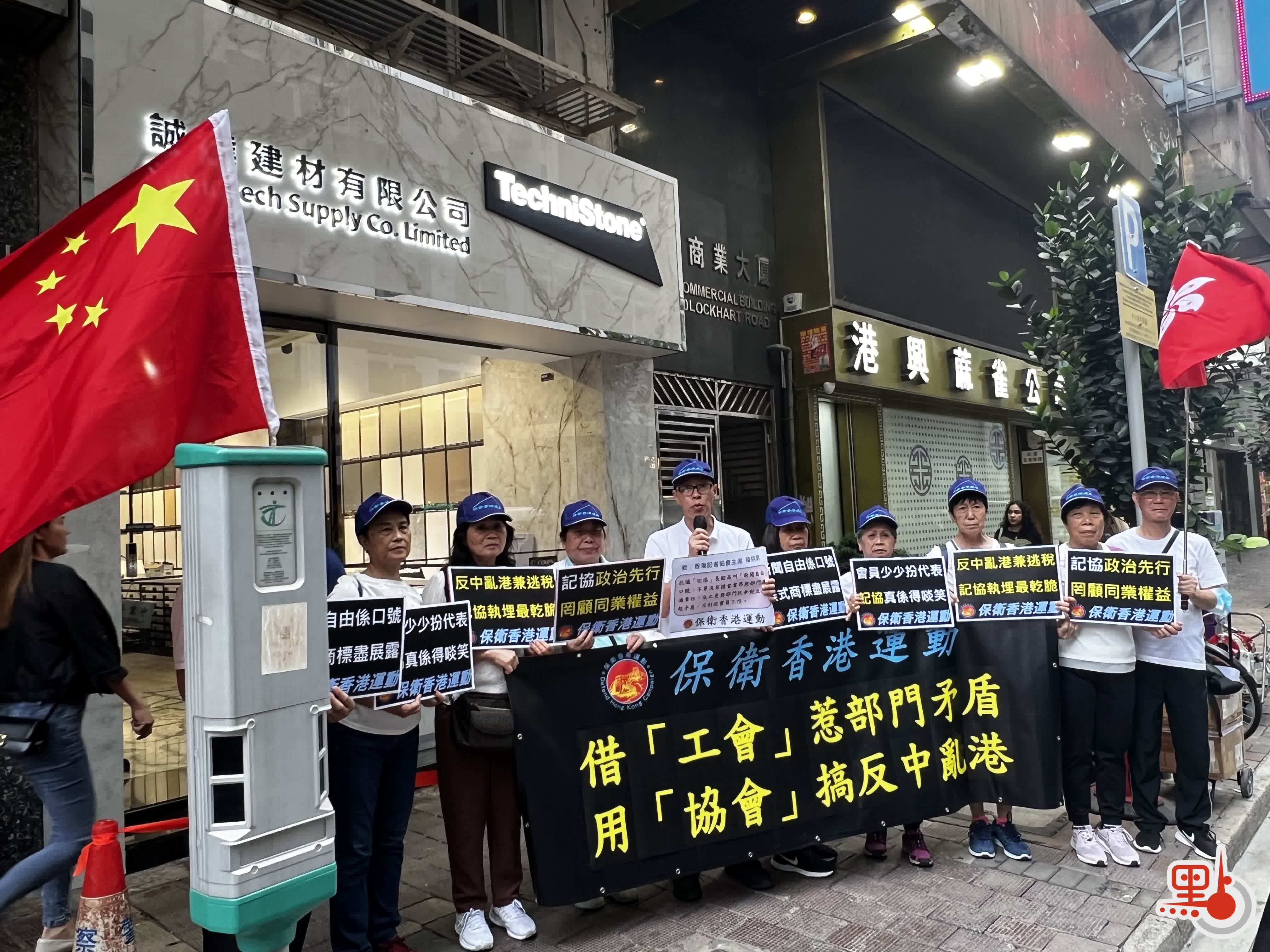 「保衛香港運動」主席傅振中一行10人今日到灣仔恒發商業大廈地下(即「記協」灣仔辦公室樓下)示威,高喊「記協政治先行 罔顧同業權益」、「反中亂港兼逃稅 記協執埋最乾脆」、「新聞自由係口號 美式雙標盡展露」等口號,抗議「記協」長期高叫「新聞自由」口號,不單沒有擔當業界與部門的溝通責任,反之更與部門抗爭對立挑起矛盾,不利從業員工作。