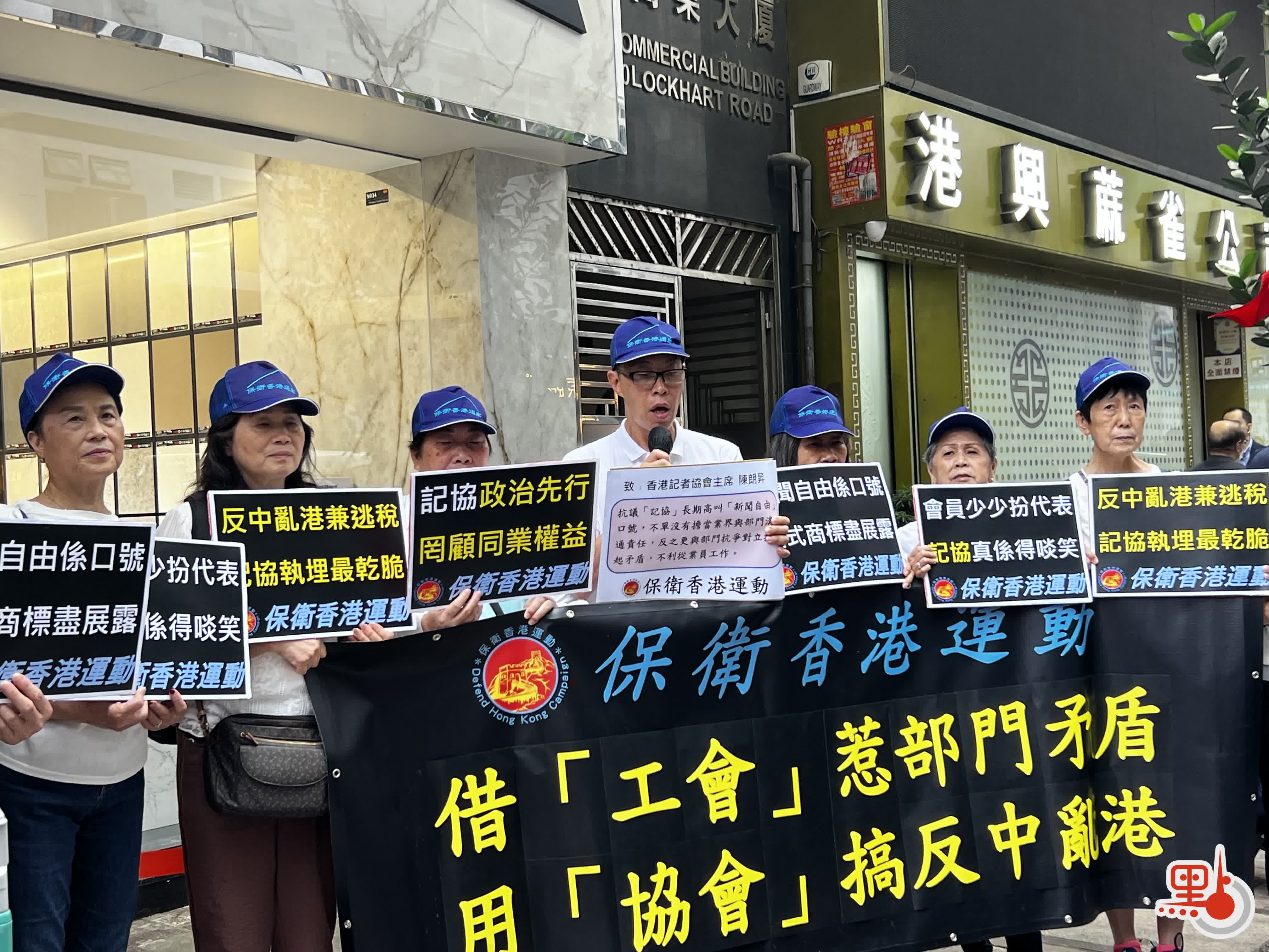 【點新聞報道】市民團體「保衛香港運動」今日(10日)下午前往香港記者協會灣仔辦公場所樓下示威,譴責「記協」藉「工會」之名行反中亂港、妨礙執法和斂財自肥之實。團體批評,「記協」是政治組織而非「工會」,並強調香港繁榮穩定不容許有這些劣行存在,要求特區政府加強對記協劣行的關注和監督規管。