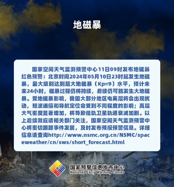 【點新聞報道】據國家預警今日(11日)發布微博消息,國家空間天氣監測預警中心11日9時發布地磁暴紅色預警:北京時間2024年05月10日23時起發生地磁暴,最大級別達到超大地磁暴(Kp=9)水平,預計未來24小時,磁暴過程仍將持續,後續仍可能發生大地磁暴。