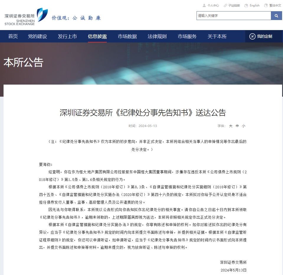 深交所公告指,經查明,夏海鈞在作為恒大地產集團有限公司控股股東中國恒大集團董事期間,涉嫌存在違反《公司債券上市規則(2018年修訂)》第1.5條、第1.6條相關規定的行為。根據《公司債券上市規則(2018年修訂)》第8.3條、《自律監管措施和紀律處分實施細則(2018年修訂)》第四十五條、《自律監管措施和紀律處分實施辦法(2020年修訂)》第四十六條的規定,深交所擬對夏海鈞給予公開認定終身不適合擔任債券發行人董事、監事、高級管理人員及公開譴責的處分。